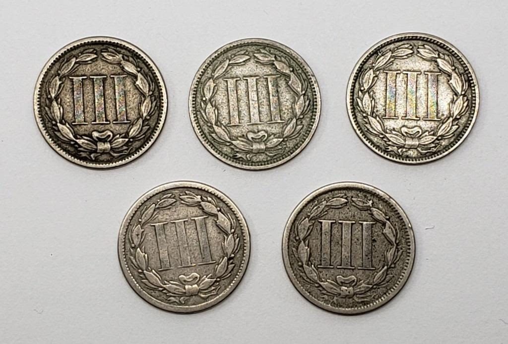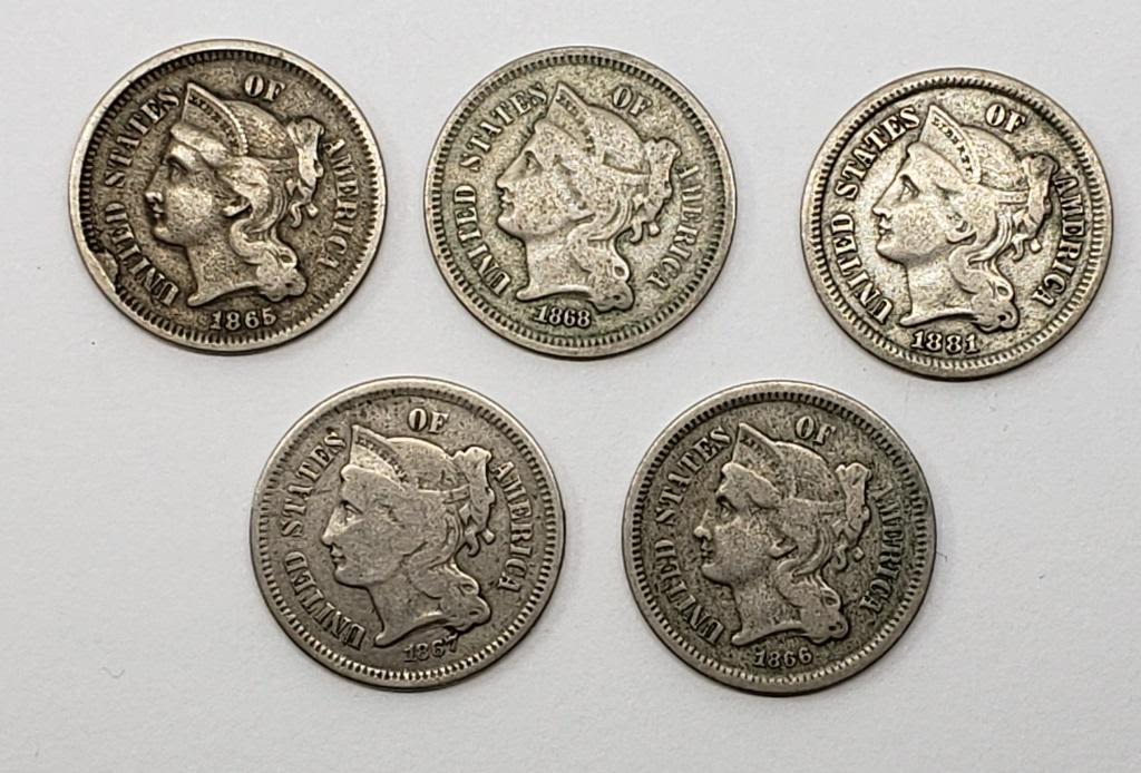 (5) THREE CENT NICKELS - ALL DIFF DATES