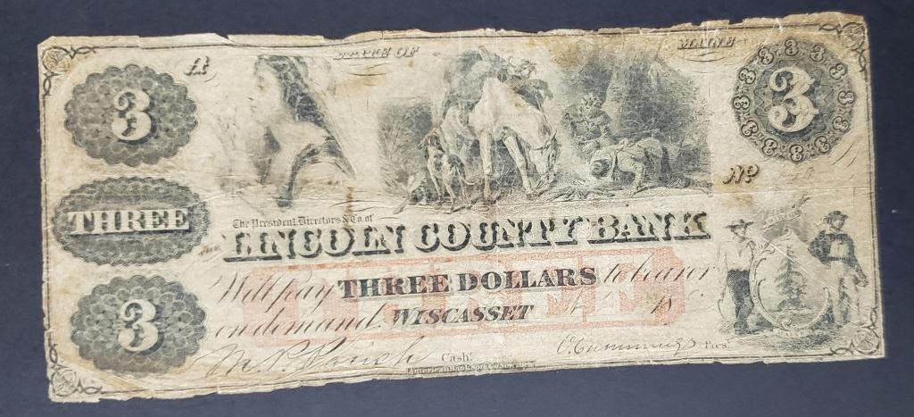 OBSOLETE THREE DOLLAR NOTE WISCASSET MAINE