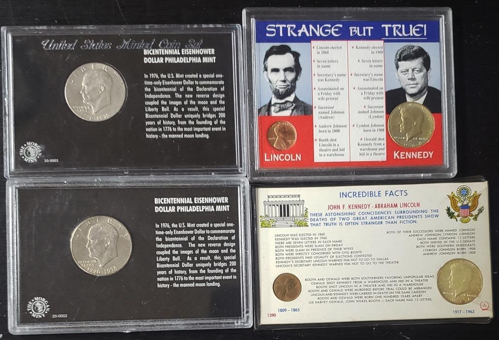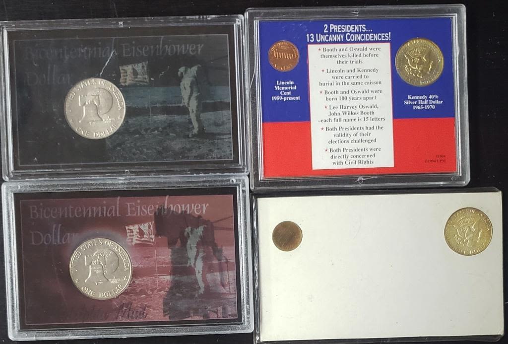 1964 &N 1968 KENNEDY HALF DOLLARS & (2) BICENTENNIAL EISENHOWER DOLLAR PHILADELPHIA MINT in MAN on THE MOON HOLDERS
