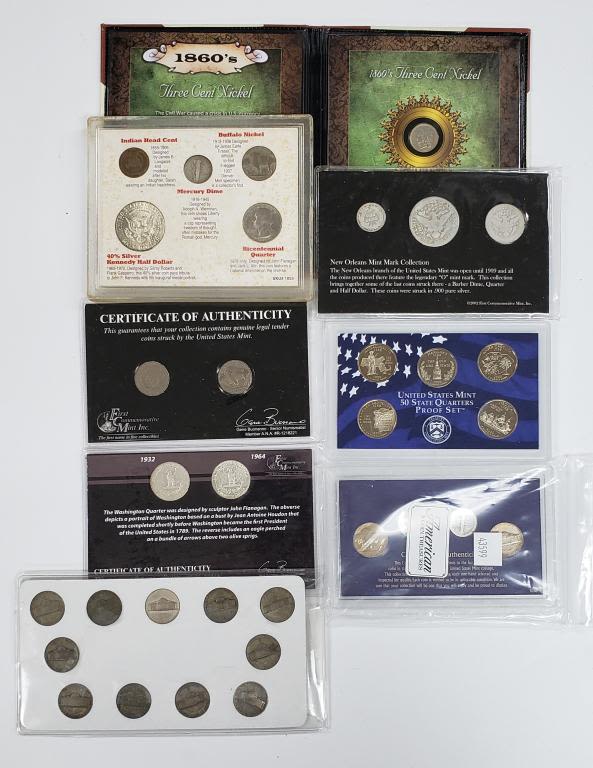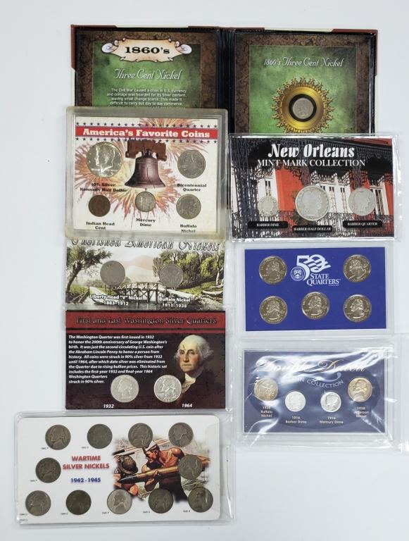 DOUBLE DATED COIN COLLECTION, AMERICA’S FAVORITE COINS, FIRST AND LAST SILVER QTRS, CHERISHED AMERICAN NICKELS, WARTIME SILVER NICKEL SET 1942-1945, THREE CENT NICKEL, 2000 STATE QTR PROOF SET