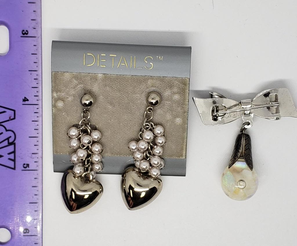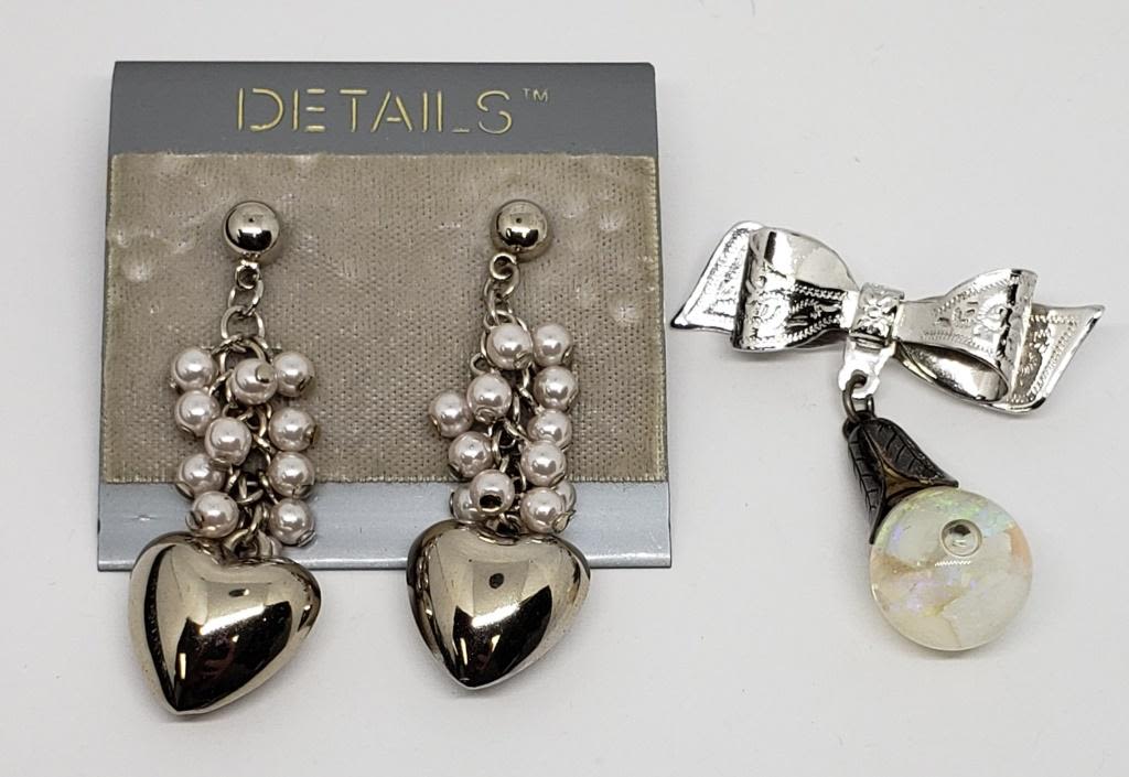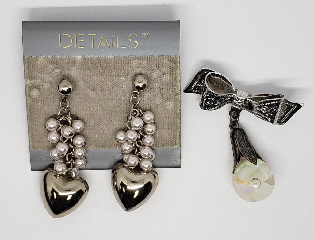 WITH GLASS TEARDROP FILLED WITH OPAL CHIPS PLUS A PAIR OF NEW! SILVER TONED PIERCED EARRINGS WITH HEART CHARM-FAUX PEARL CHARMS