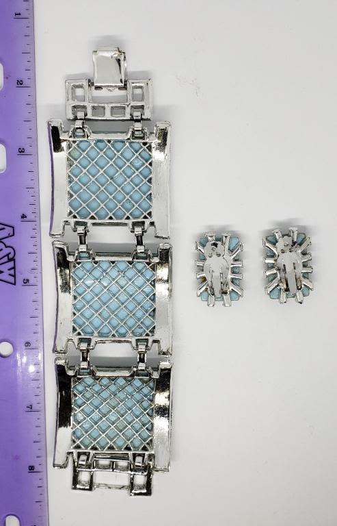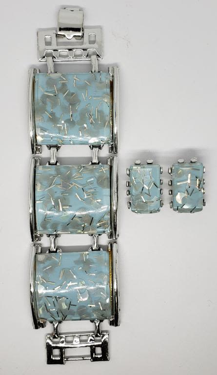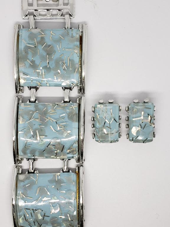 BABY BLUE AND SEQUENCE LUCITE PLUS MATCHING CLIP ON EARRINGS