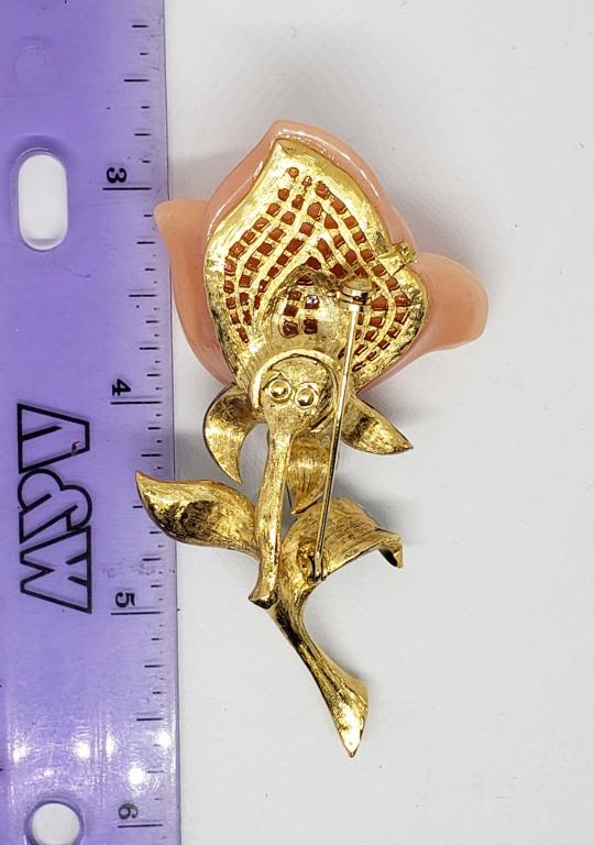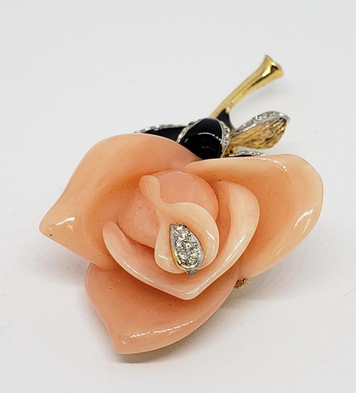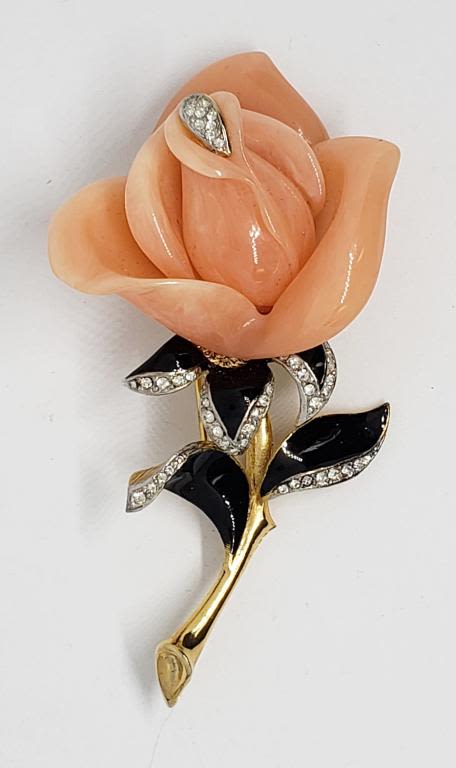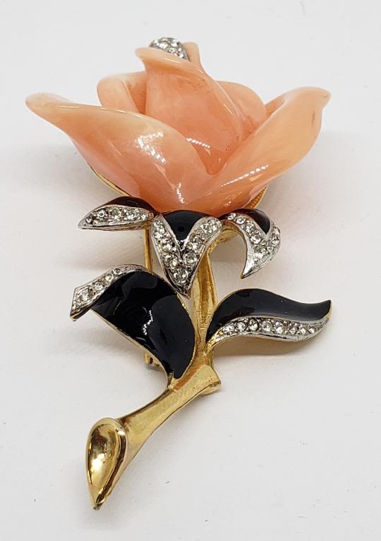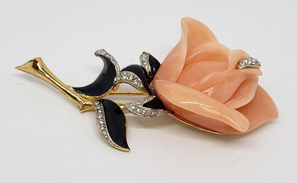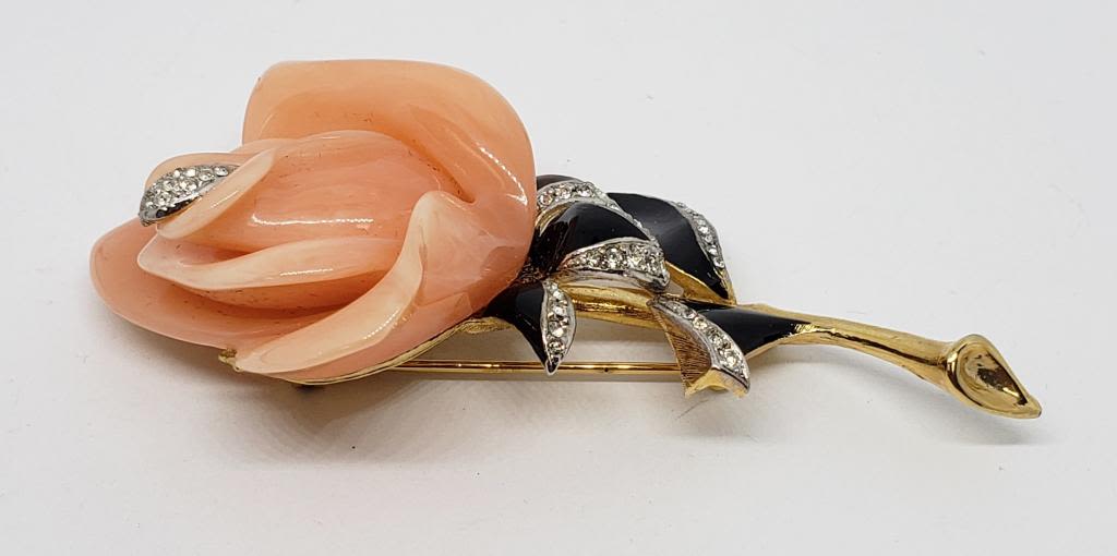 PEACH CARVE BAKELITE PETALS-RHINESTONES AND BLACK ENAMEL-LOOKS NEW!