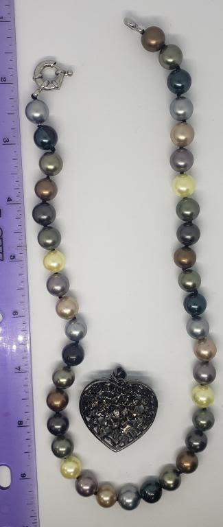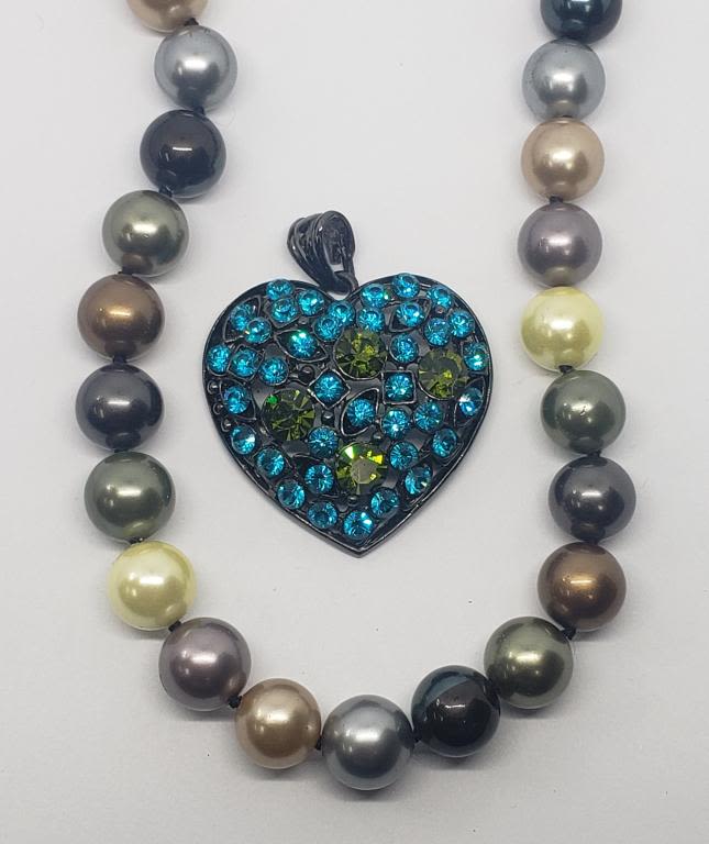 PENDANT-EARTH TONES ON BEADED NECKLACE & BLUE AND GREEN RHINESTONE ACCENTS