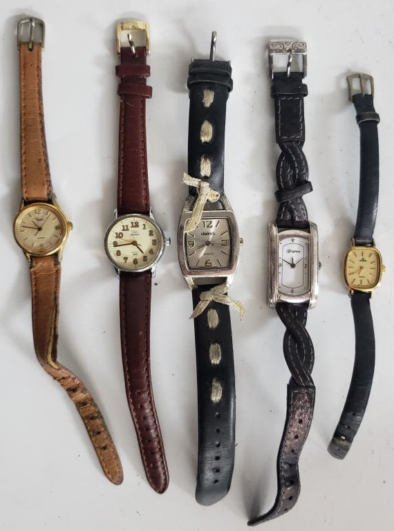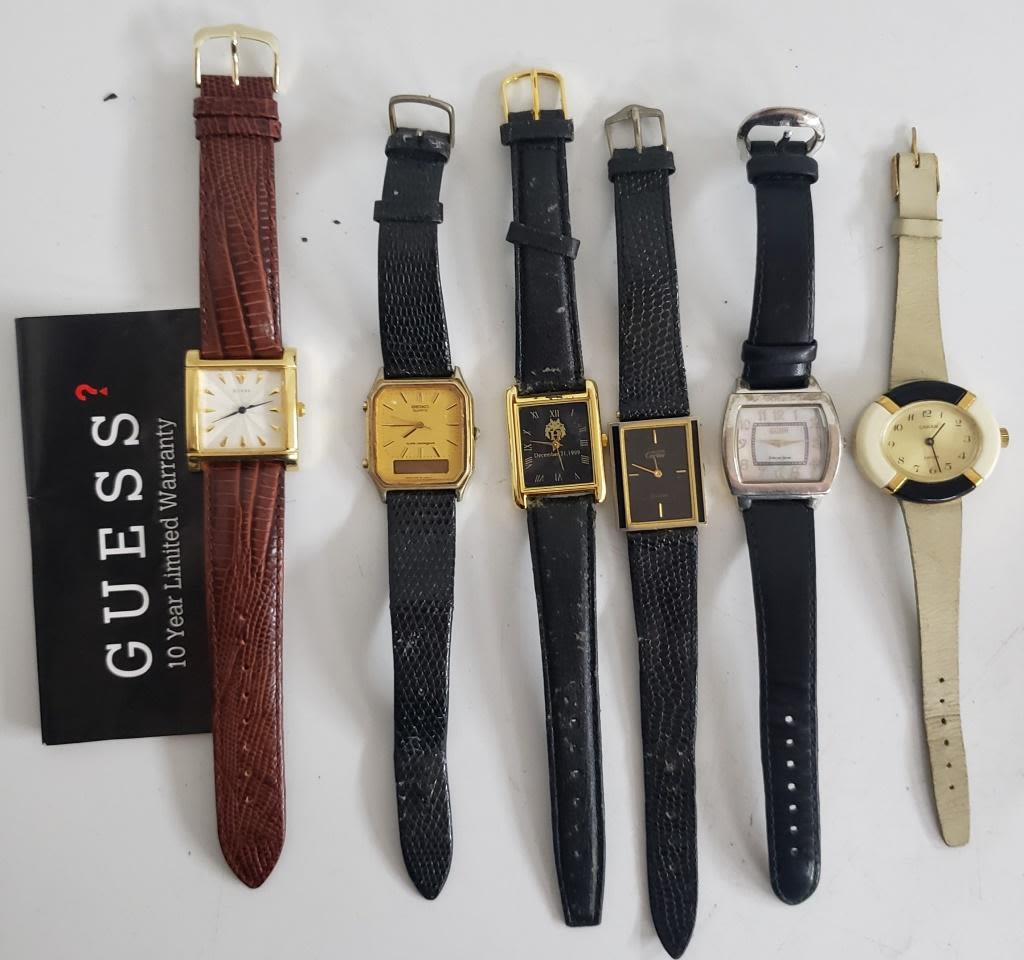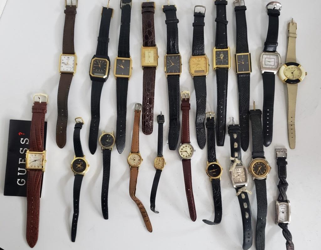 Not tested as to working or not-most will need battery replacement-some for parts or repair -some may work:20 WOMENS QUARTZ WATCHES-GUESS-CARTIER, (2)TIMEX, CARAN, (2)SEIKO , CHEROKKE, ECCLISSI-BRIGHTON, (2)CITIZEN, METEC-