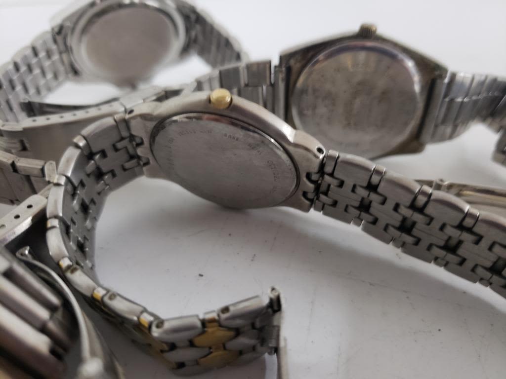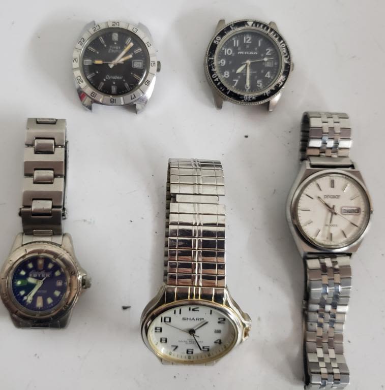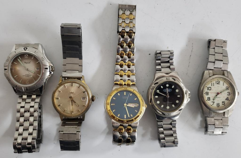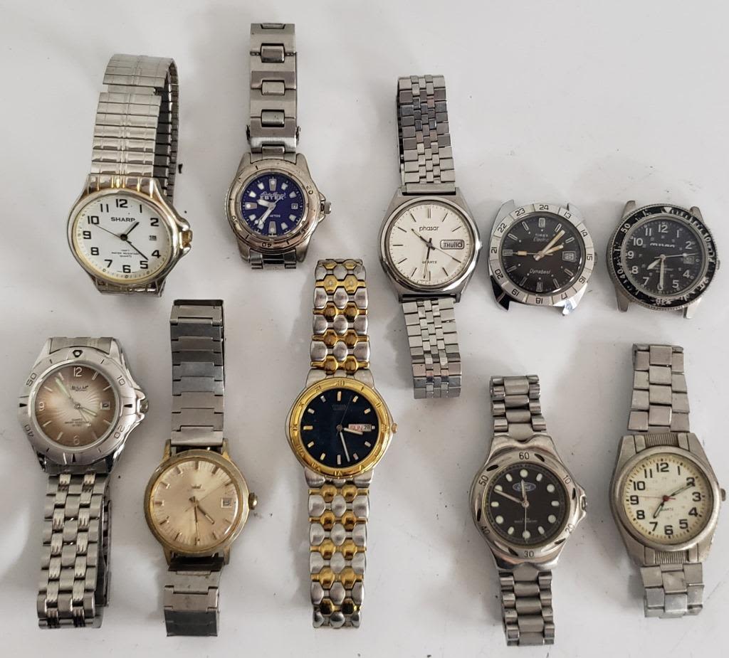 Not tested as to working or not-most will need battery replacement-some for parts or repair -some may work:10 MENS WATCHES-FORD, SHARP, PHASAR, CITIZEN, MILAN, TIMEX , WEST CLOX, EDDIE BAUER