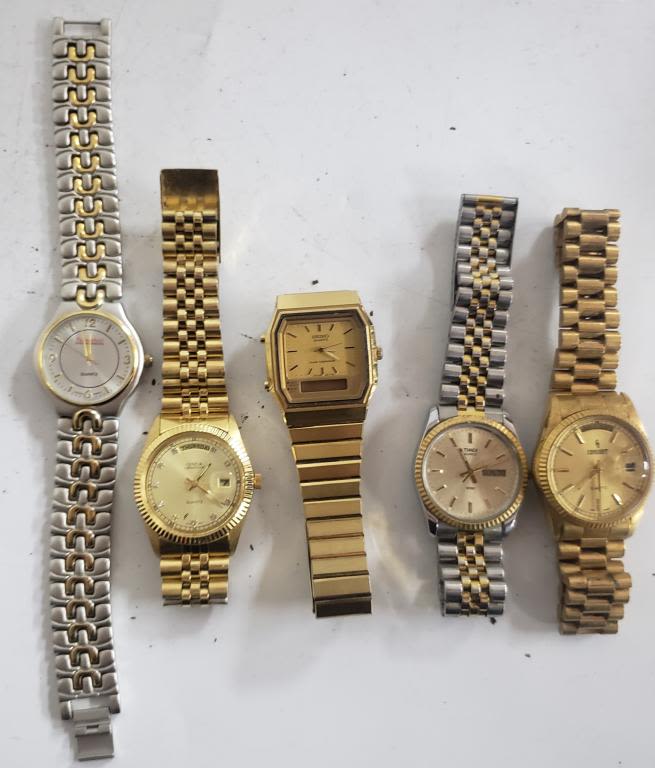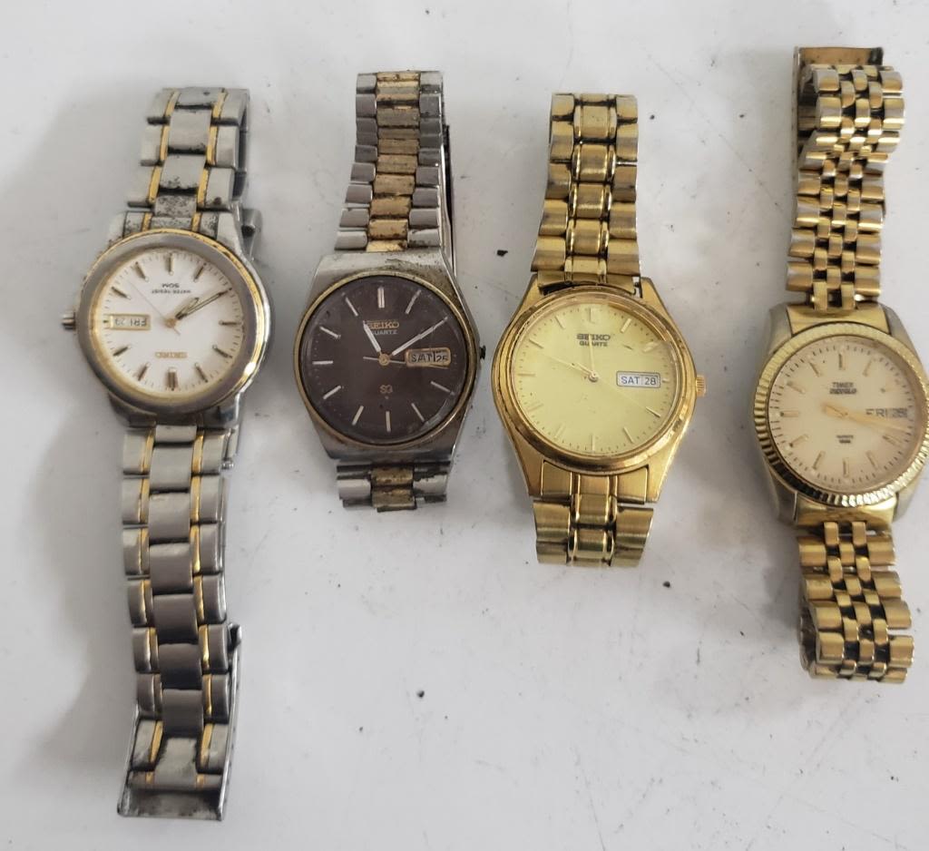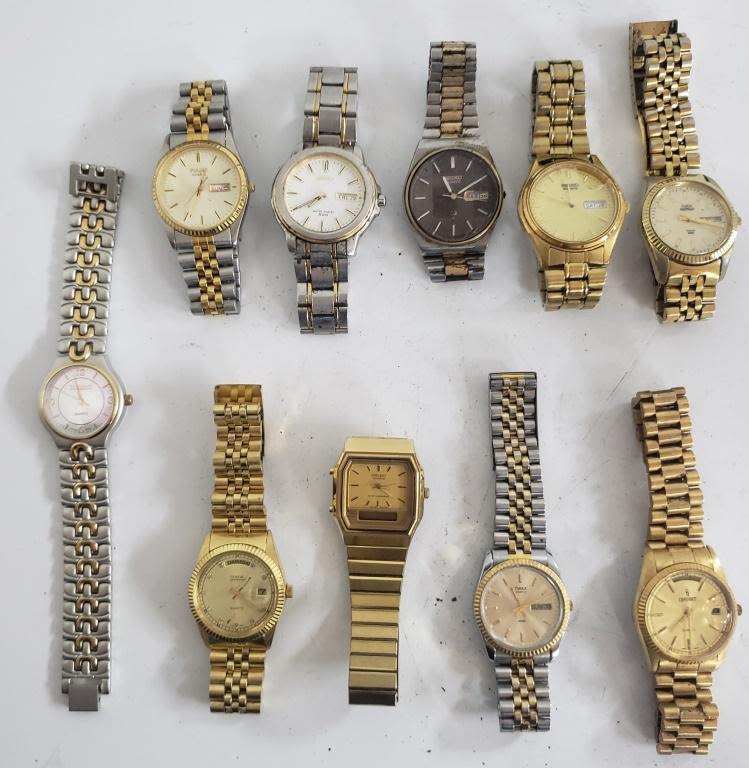 Not tested as to working or not-most will need battery replacement-some for parts or repair -some may work:10 MENS WATCHES-(4)SEIKO, (2)TIMEX, GENEVA, Consort, Fahr enheit , Pulsar