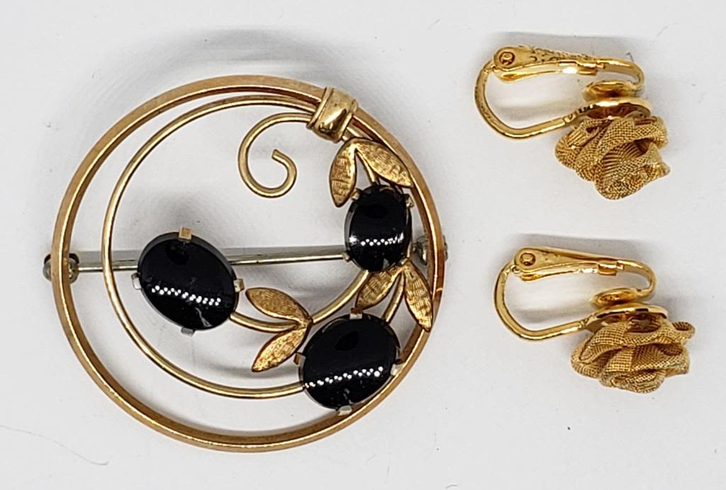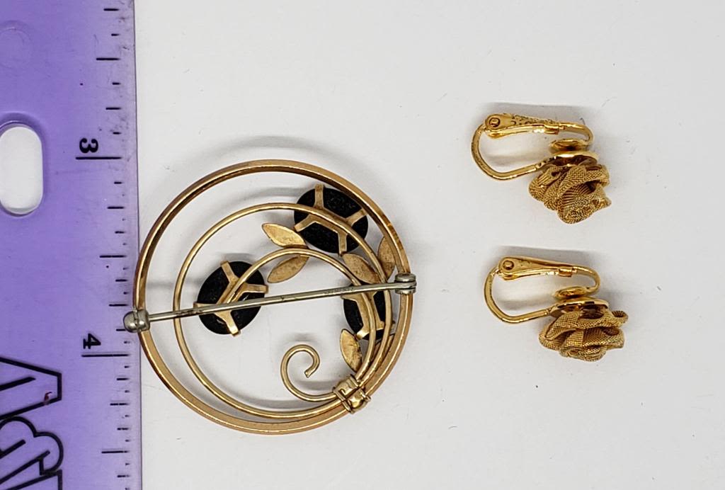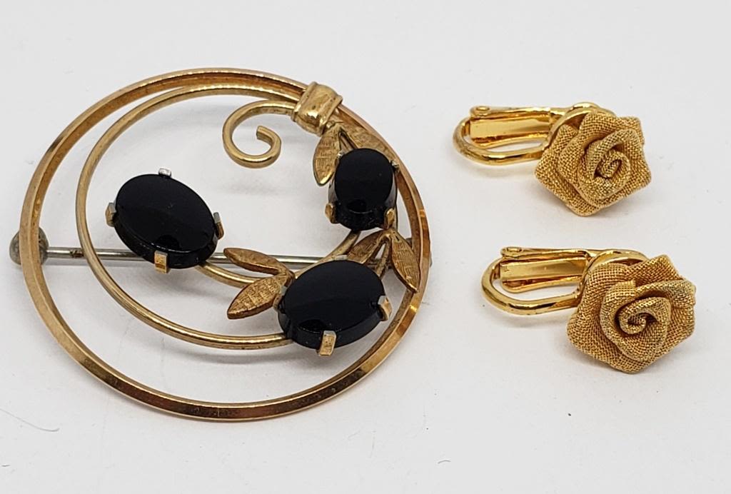 WITH BLACK LUCITE PLUS GOLD TONED ROSE CLIP ON EARRINGS