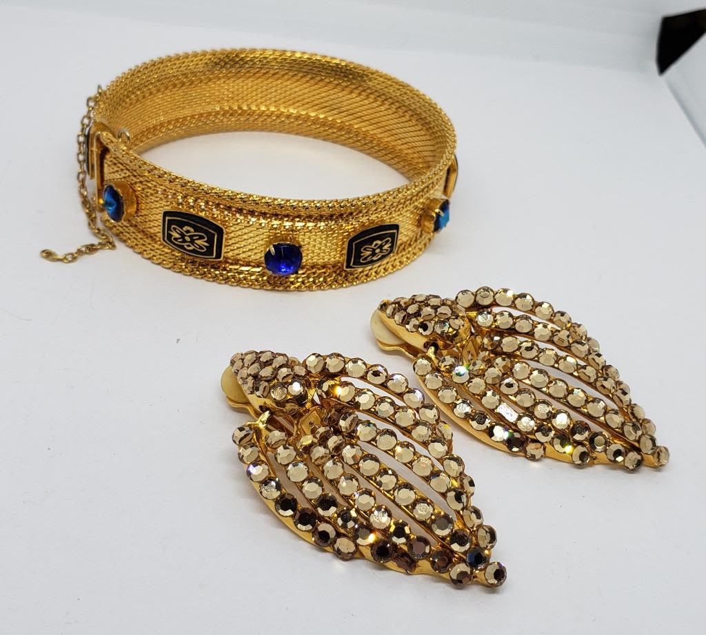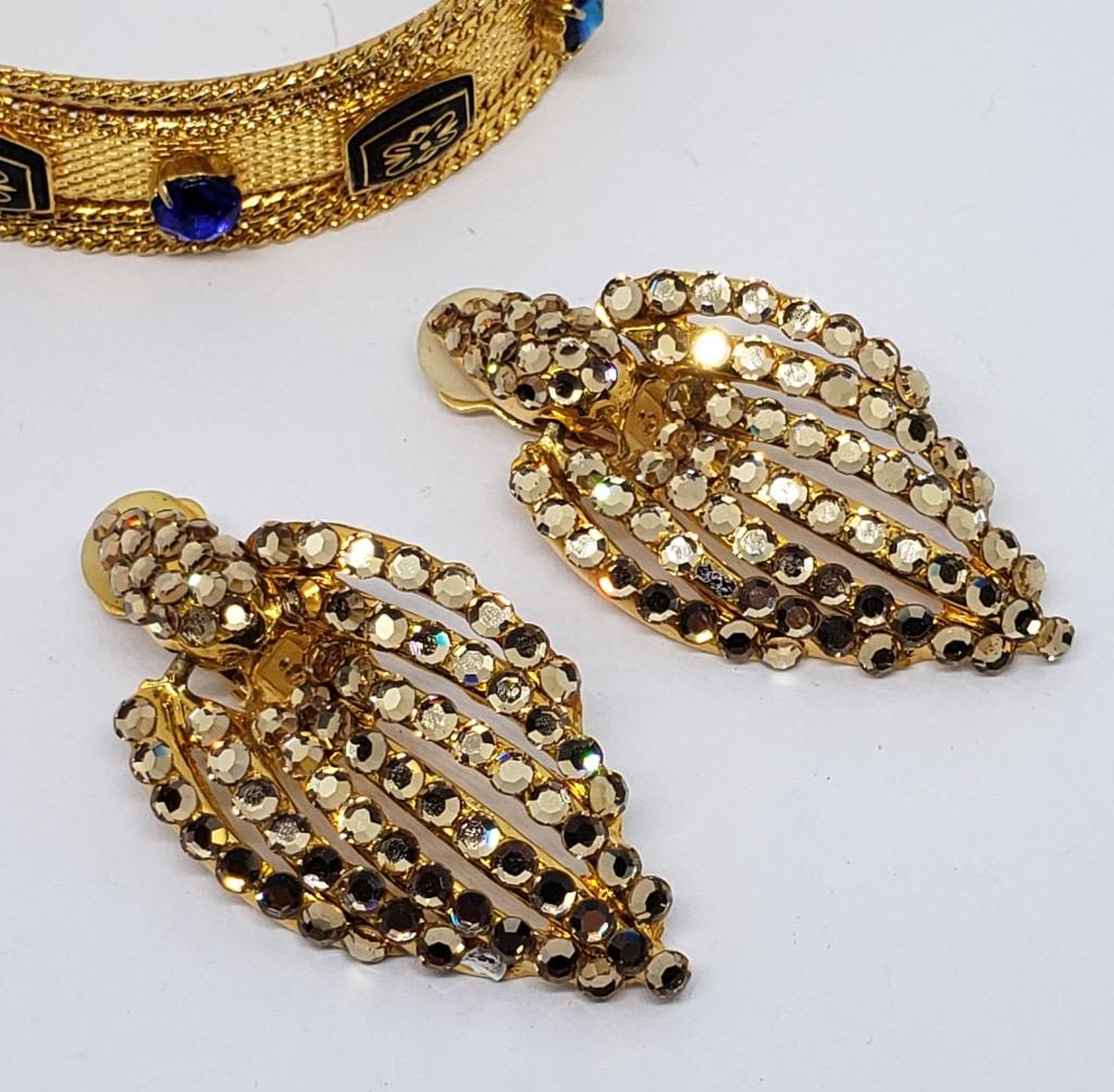 BLUE RHINESTONES AND ENAMEL PLUSE PAIR OF GOLD TONED CLIP ON DANGLY RHINESTONE EARRINGS