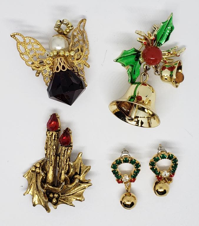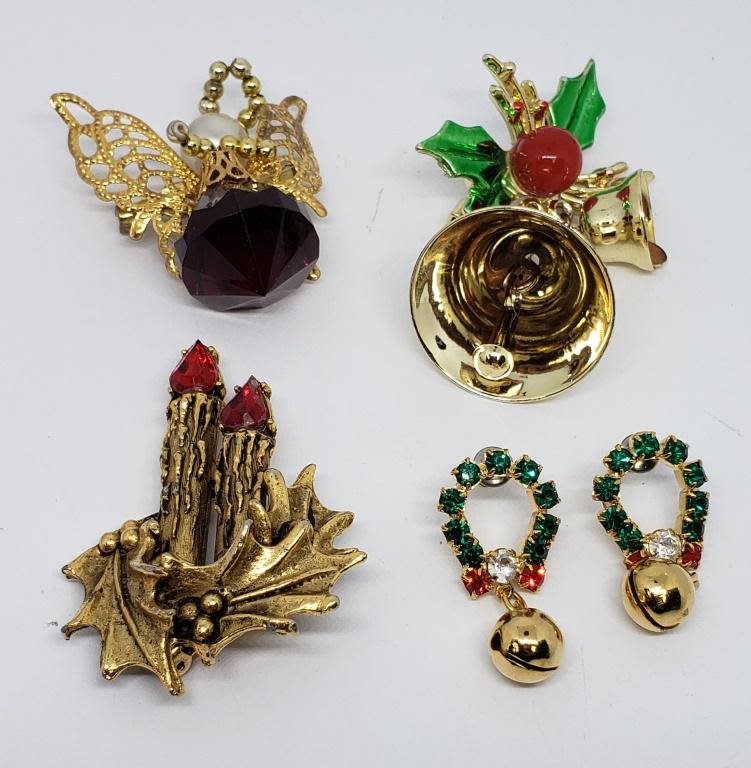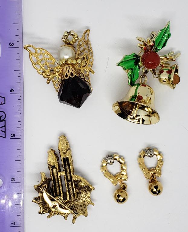 (1)ANGEL WITH RUBY RED CRYSTAL (1)BELL BROOCH (1)CANDLESTICK BROOCH WITH RUBY RED RHINESTONES (1)PAIR OF WREATH RHINESTONE PIERCED EARRINGS