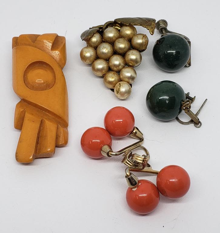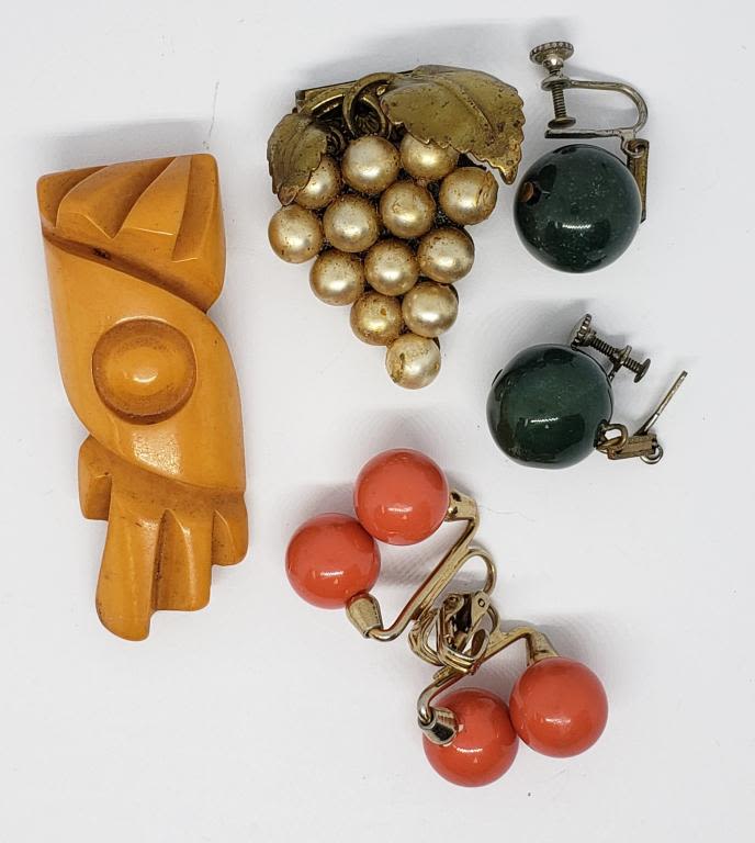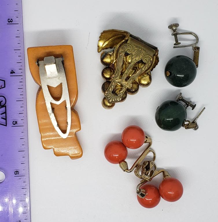 CLIP (1)PAIR OF CORAL CLIP ON EARRINGS (1)PAIR OF GREEN TWIST BACK EARRINGS & (1)GRAP CLUSTER COLLAR CLIP