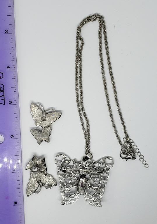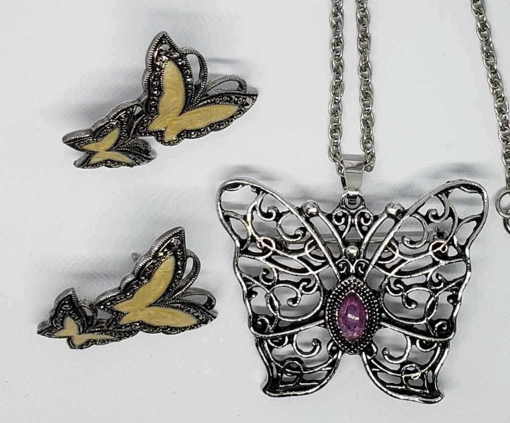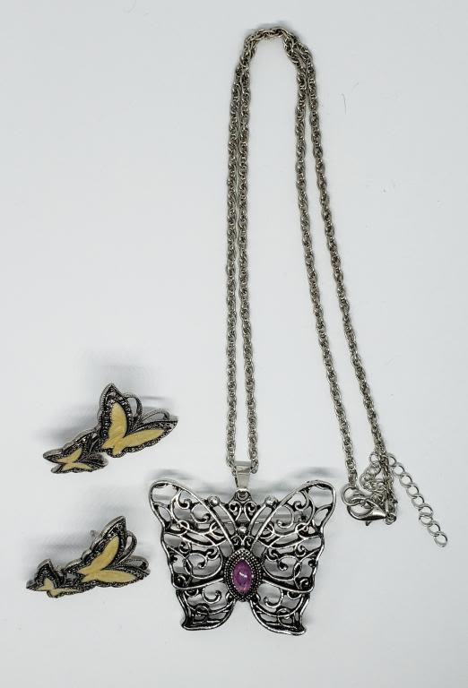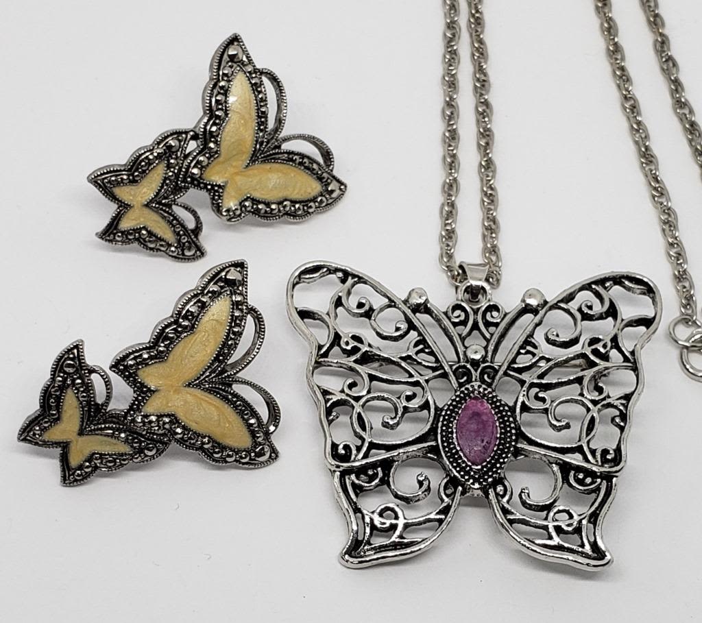 PIERCED MARCASITE EARRINGS WITH ENAMEL & (1)NECKLACE WITH FILIGREE WINGS AND PURPLE LUCITE CENTER