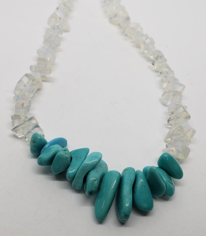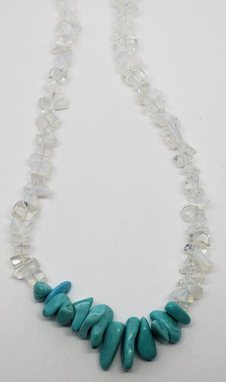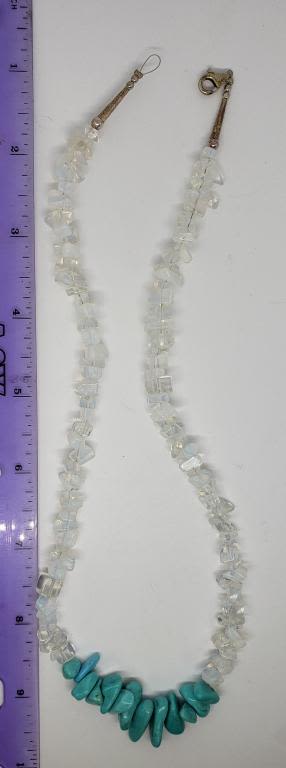 CLEAR NATURAL STONE BEADS & TURQUOISE 18" LONG NECKLACE