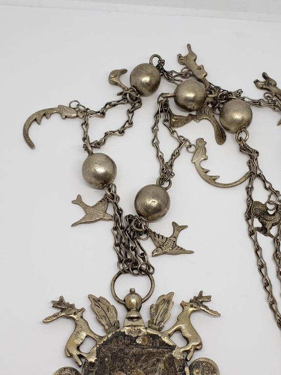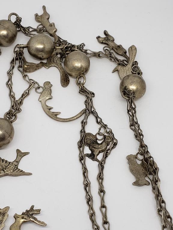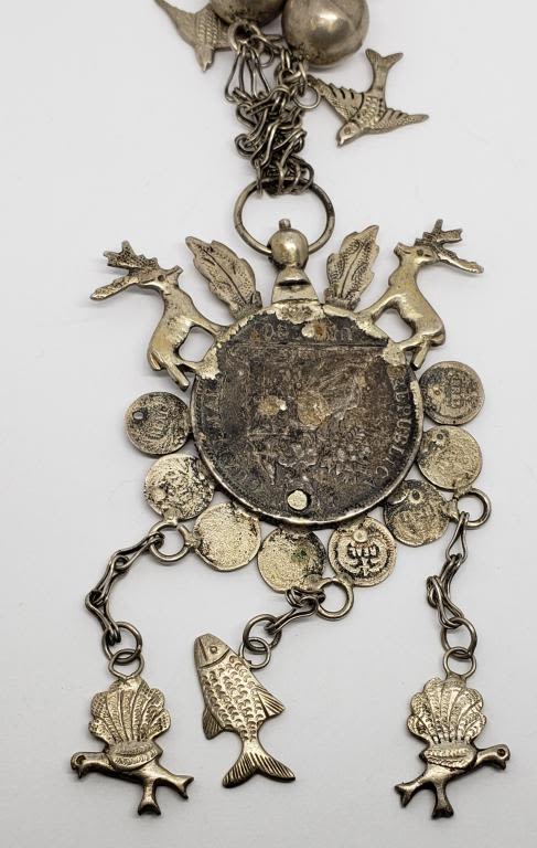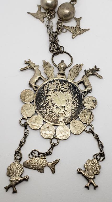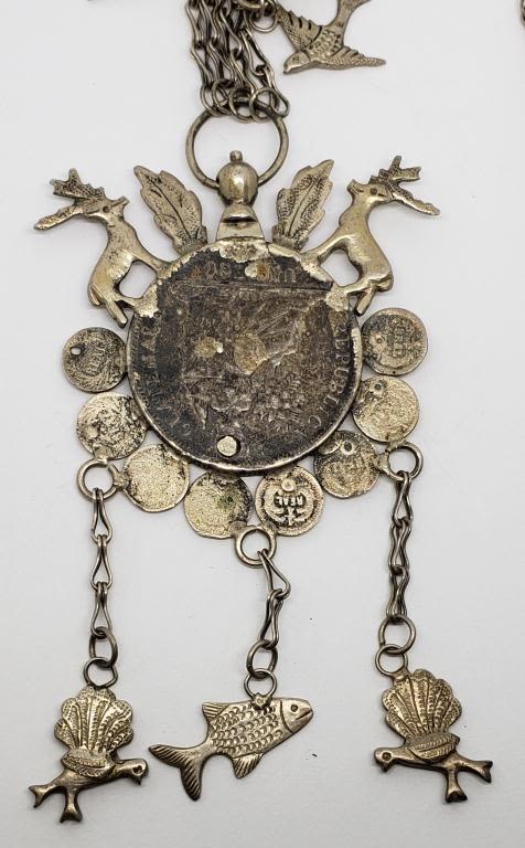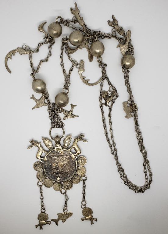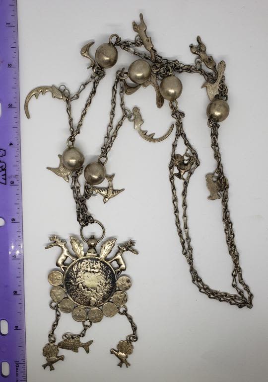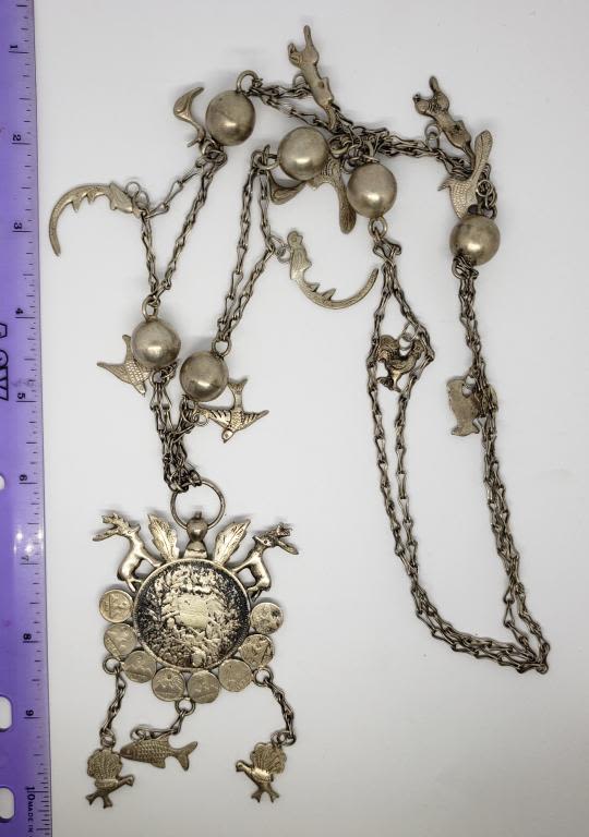 NECKLACE .900 SILVER UN PESO COIN CRAFTED into STERLING SYMBOLIC NEKCLACE w/DEER, BIRD of PARADISE, FISH, PEACOCK, DUCK, ROOSTER & OTHER ANIMAL on 30" STERLING CHAIN – VERY UNIQUE PIECE (70.1 DWT)
