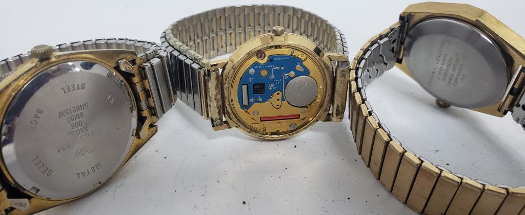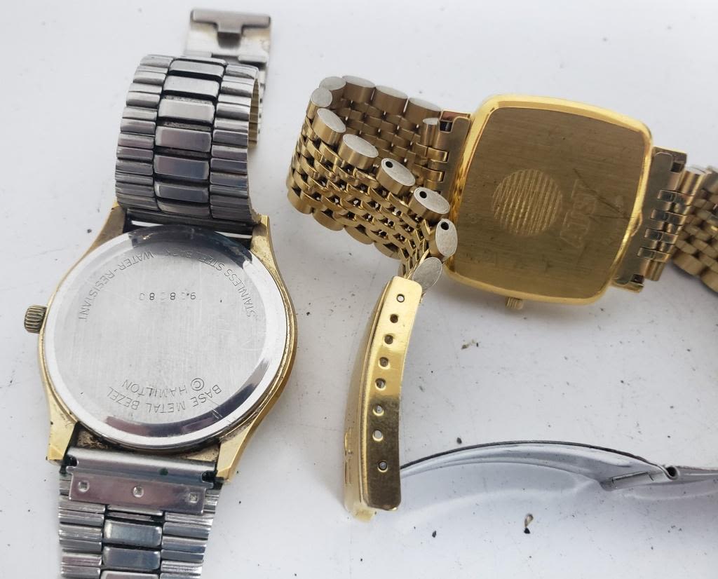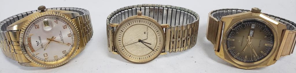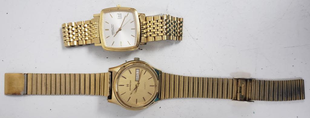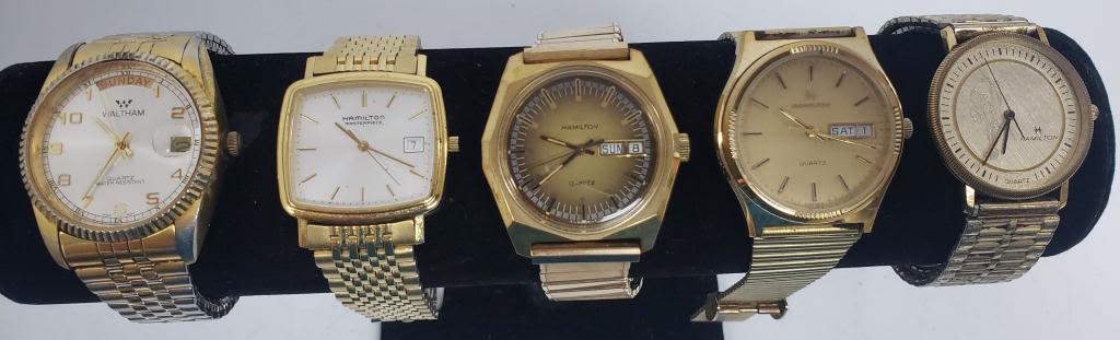 Not tested as to working or not-most will need battery replacement-some for parts or repair -some may work:5 MENS QUARTZ WATCHES-(4)HAMILTON, (1) WALTHAM