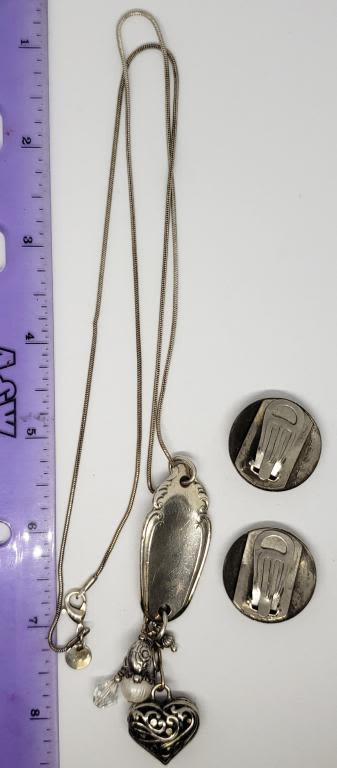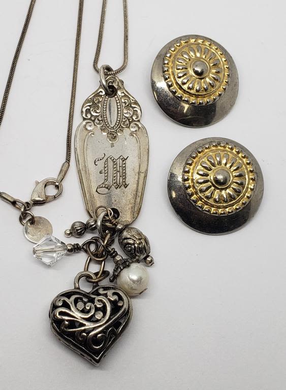 "M" ENGRAVED on SPOON – DANGLE’s ARE NOT STERLING – CLIP-ON STERLING BUTTON EARRINGS (20.3 DWT)