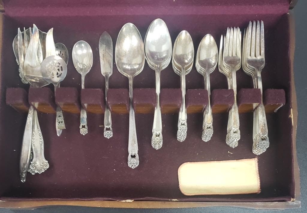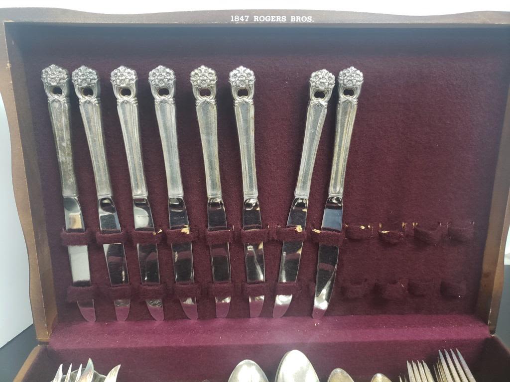 Comes with 8 Knives, 8 Dinner Forks, 8 Salad Forks, 16 Teaspoons, 8 Tablespoons, 2 Serving Spoons, and 2 other pieces. Also comes with some non-matching serving pieces.