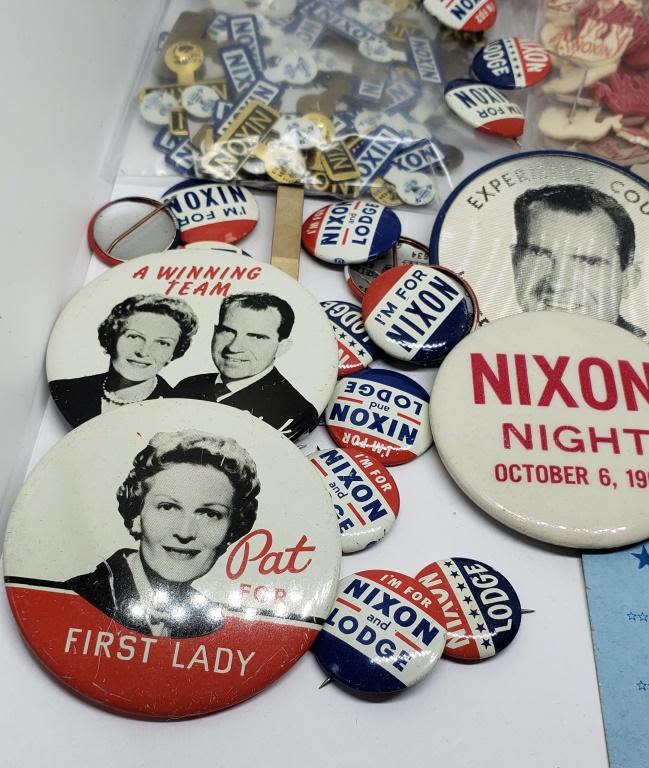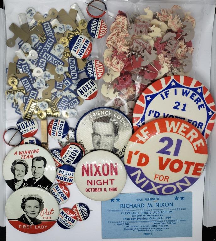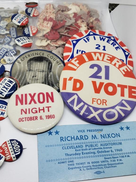 (6) LARGE NIXON BUTTONS; (21) SMALL BUTTONS; (134) PLASTIC NIXON ELEPHANT PINS; (12) METAL NIXON PINS & NIXON TIE CLIP & 1960 TICKET in CLEVELAND PUBLIC AUDITORUIM