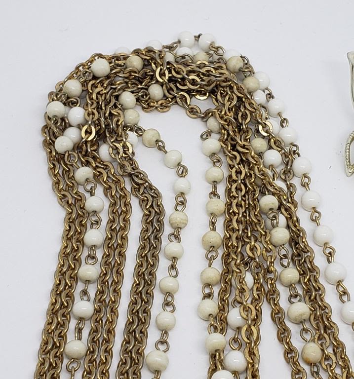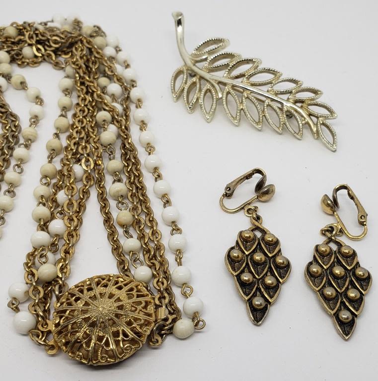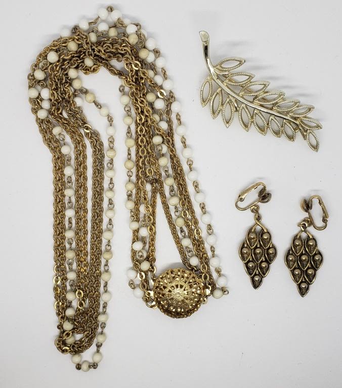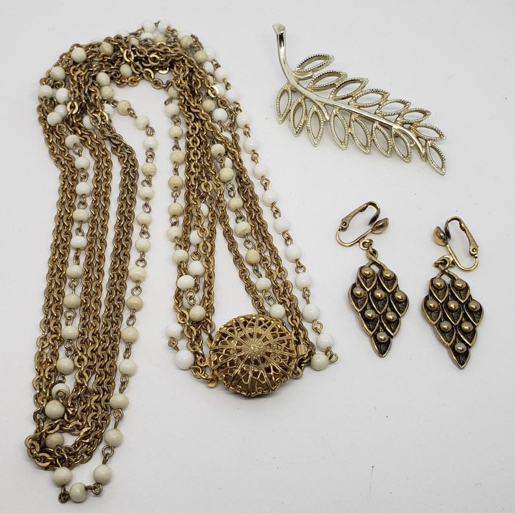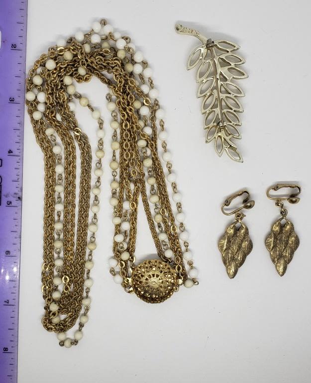 LAYERED NECKLACE AND WHITE BEAD ACCENTS (1)LEAF BROOCH (1)SARAH COVENTRY CLIP ON DANGLY EARRINGS