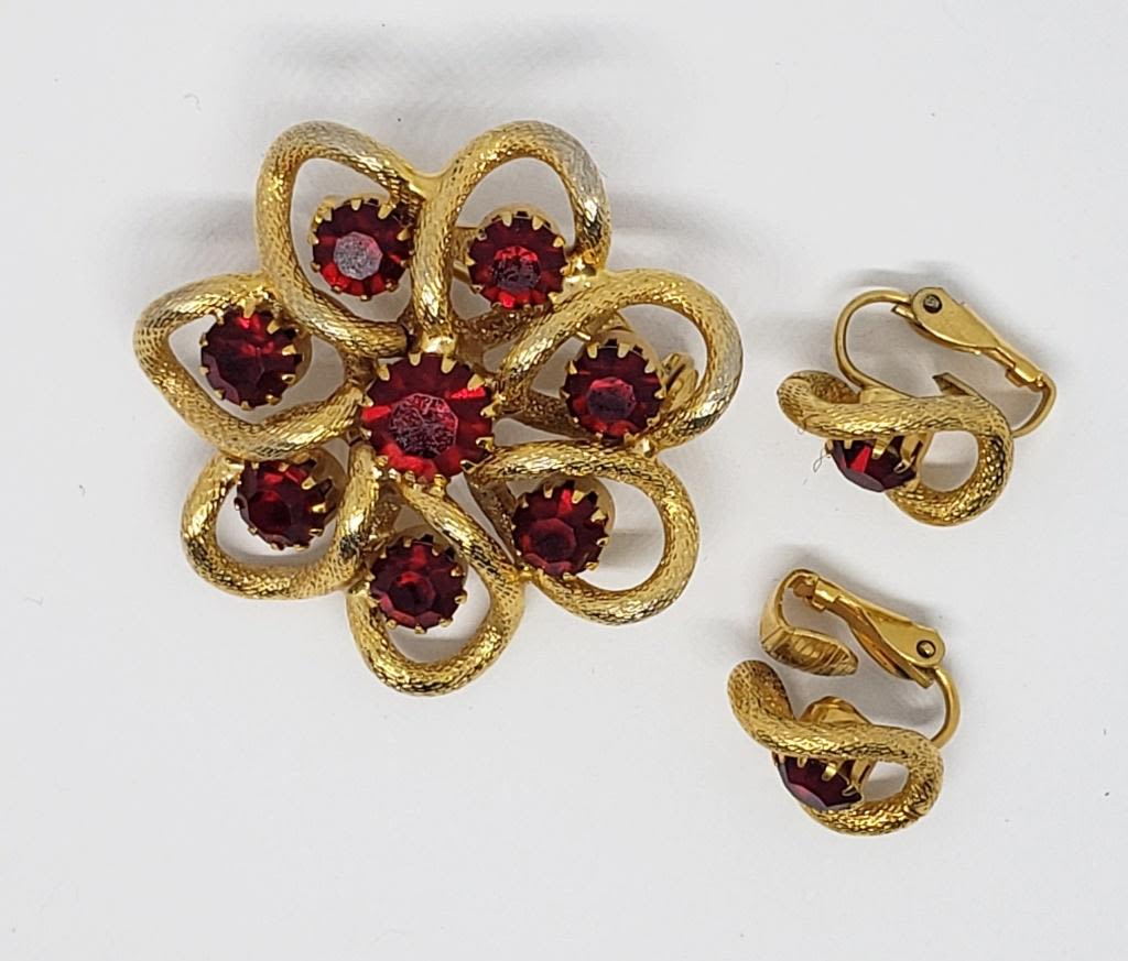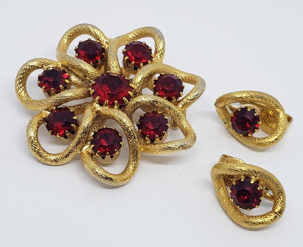 RUBY RED RHINESTONES WITH MATCHING PAIR OF CLIP ON EARRINGS