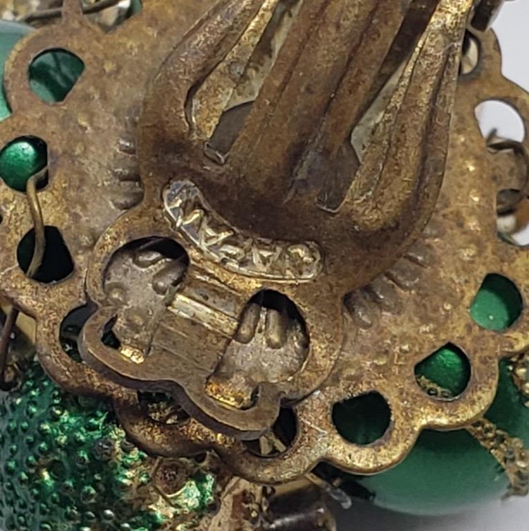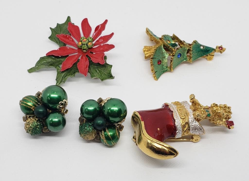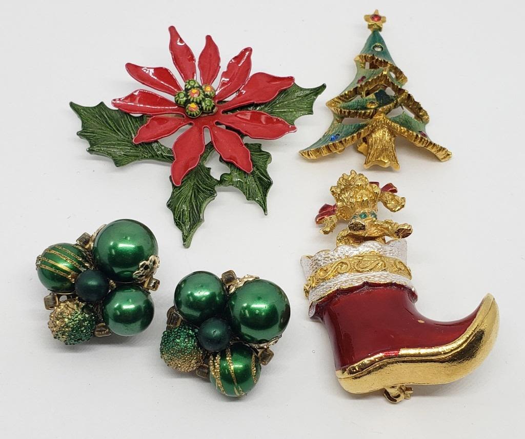 STOCKING-POINSETTA WITH ENAMEL AND RHINESTONES & (1)PAIR OF JAPAN MADE BEADED CLIP ON EARRINGS