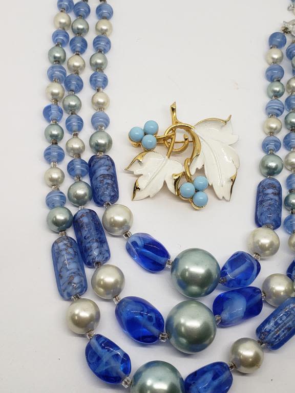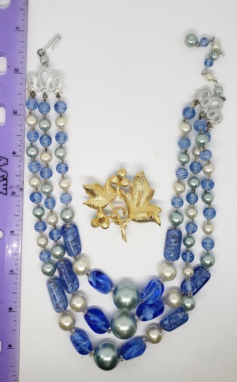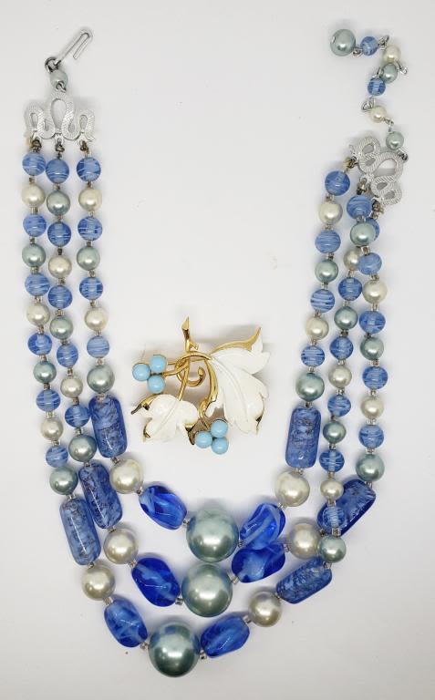 NECKLACE PLUSE GODL TONED SARAH COVENTRY BROOCH WITH WHITE ENAMEL AND BABY BLUE LUCITE BEADS