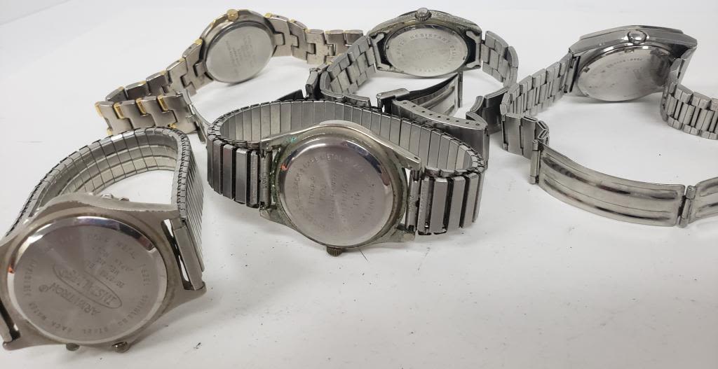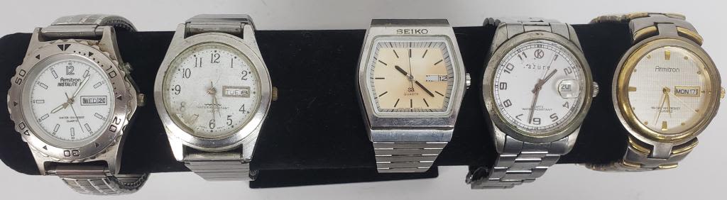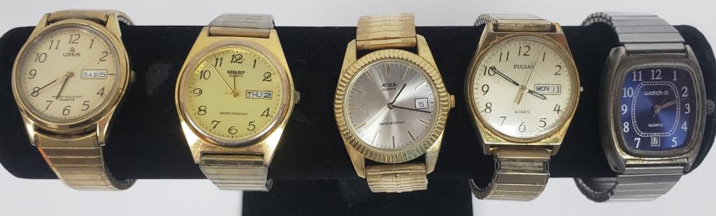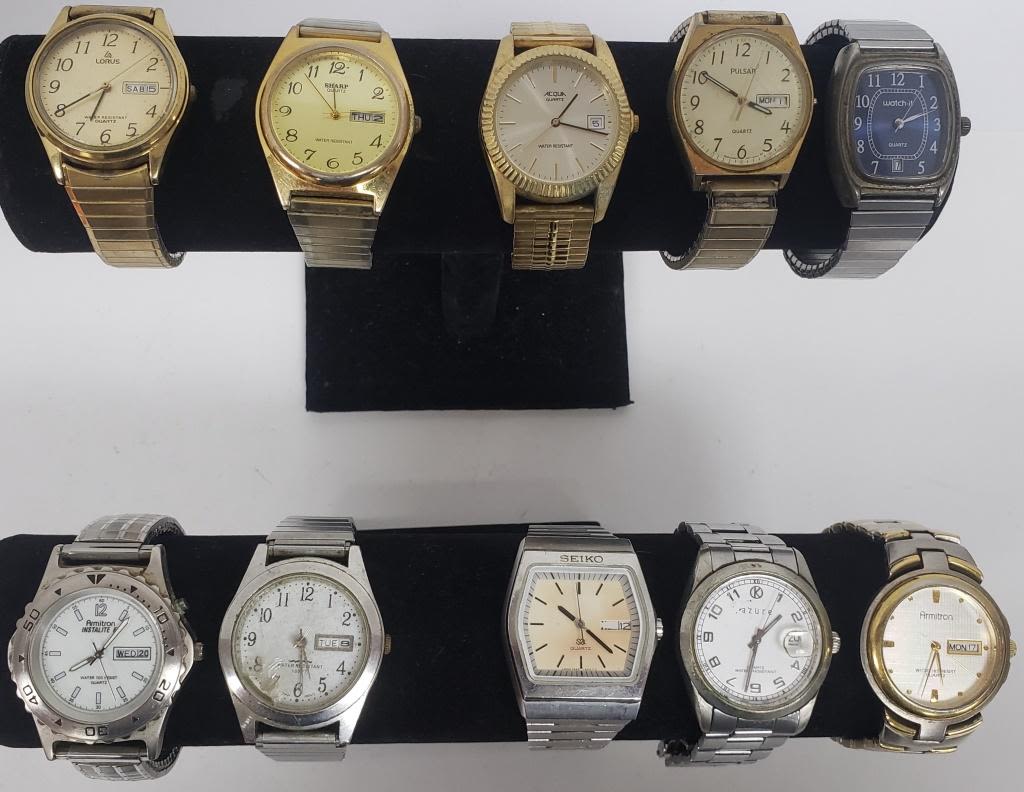NOT TESTED AS TO WORKING OR NOT-MOST WILL NEED BATTERY-SOME FOR PARTS OR REPAIR-SOME MAY WORK-10 MENS QUARTZ WRIST WATCHES- SEIKO, SHARP, LORUS, WATCH IT, (2)ARMITON, PULSAR, ACQUA, AZURE, MISC.