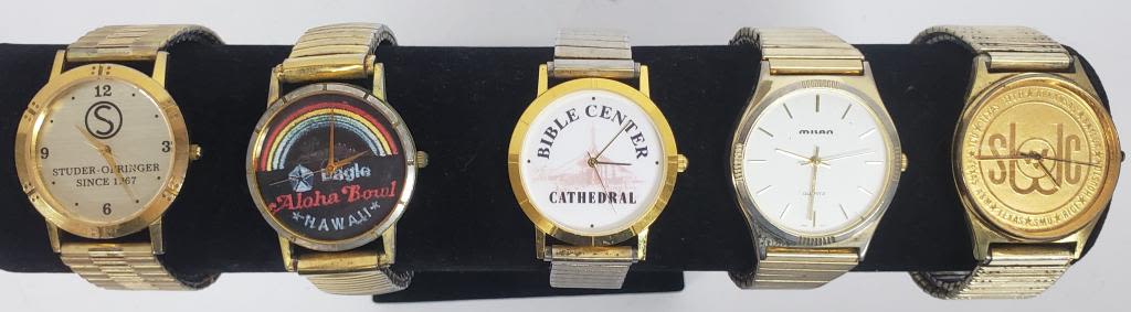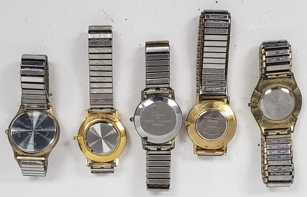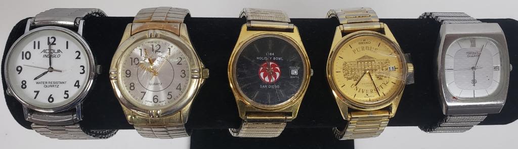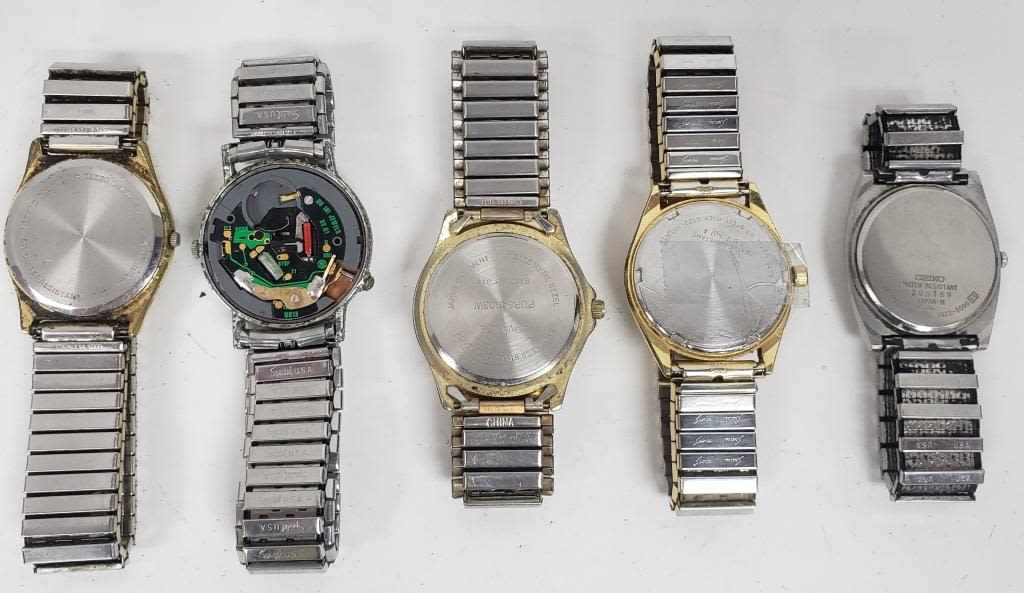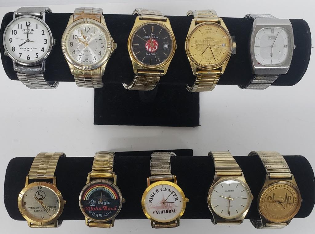 NOT TESTED AS TO WORKING OR NOT-MOST WILL NEED BATTERY-SOME FOR PARTS OR REPAIR-SOME MAY WORK-10 MENS QUARTZ STRETCH BAND WRIST WATCHES-HELBROS, HAMILTON, MILAN, IMAGE, (2) SEIKO, ADVANCE, ACQUA, MISC