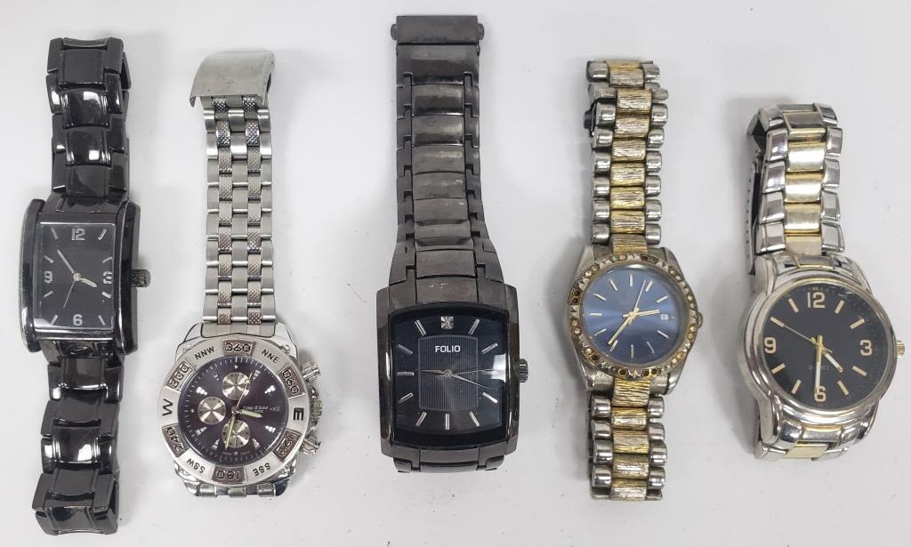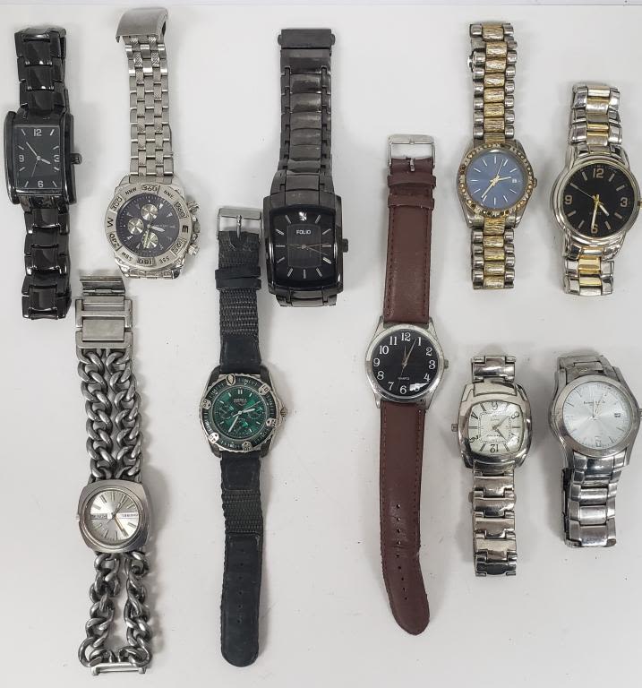 NOT TESTED AS TO WORKING OR NOT-MOST WILL NEED BATTERY-SOME FOR PARTS OR REPAIR-SOME MAY WORK-10 MENS QUARTZ WRIST WATCHES- AMERICA PERRY ELLIS, (2)COTE D’AZUR, KENNETH COLE, ALLUDE, DIESEL, FOLIO, JEAN PAUL, MISC