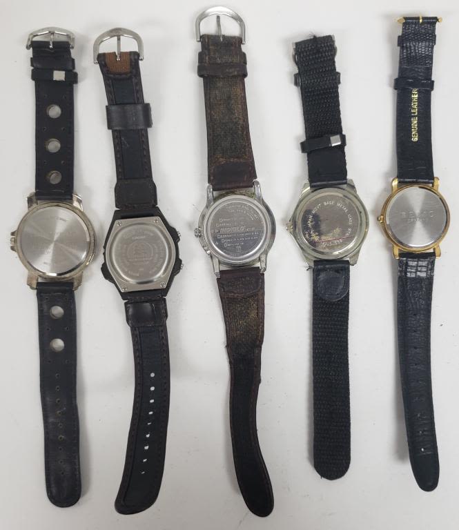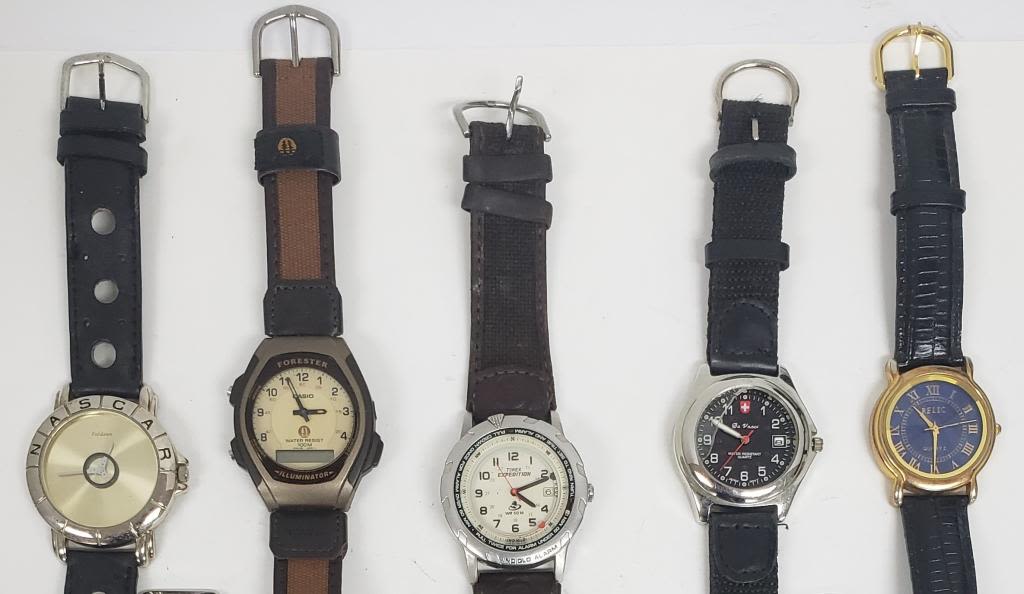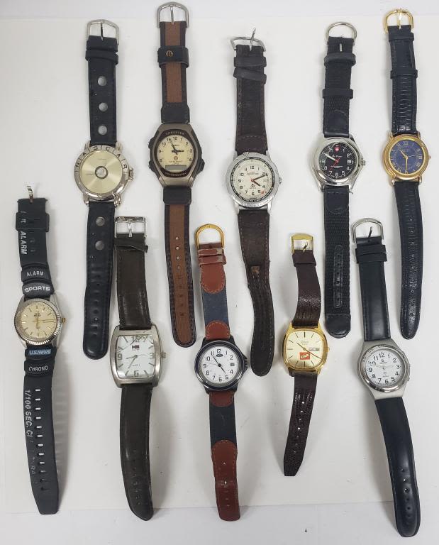 NOT TESTED AS TO WORKING OR NOT-MOST WILL NEED BATTERY-SOME FOR PARTS OR REPAIR-SOME MAY WORK-10 MENS QUARTZ WRIST WATCHES-(2)TIMEX, CASIO, BUGLE BOY, RELIC, DA VANCI, FORD, ELGIN, VALDAWN, ON TIME ATOMIC