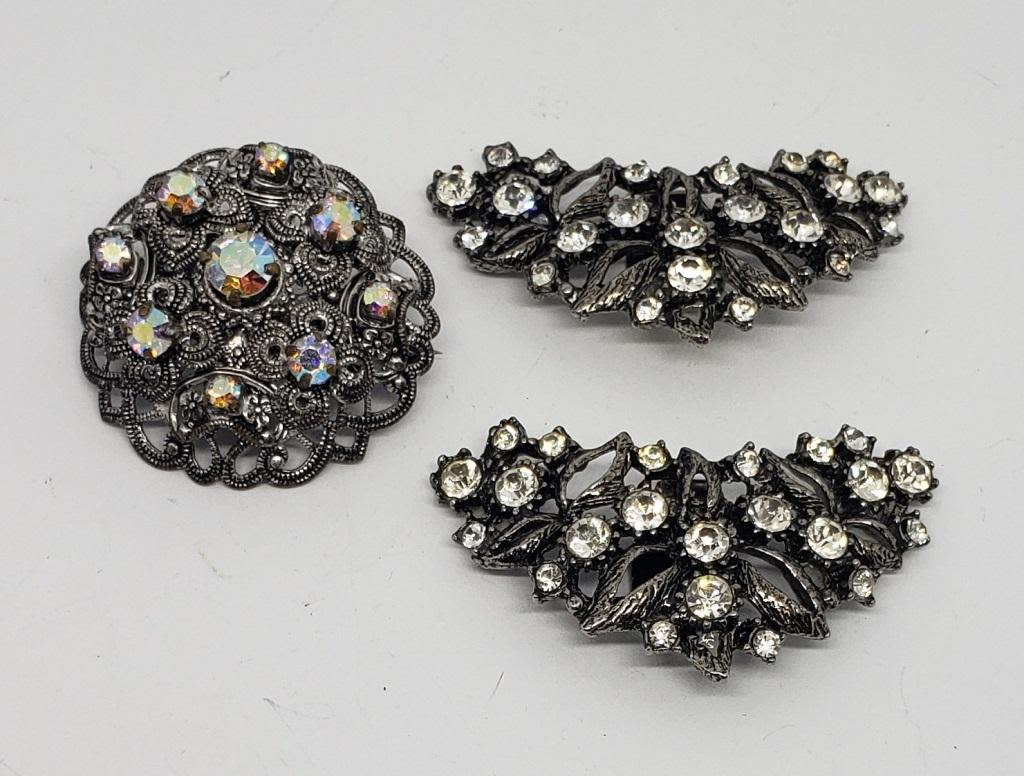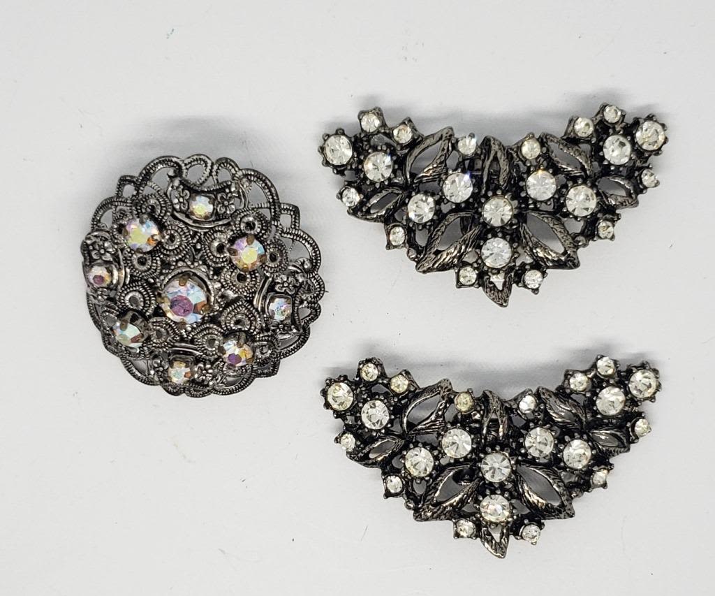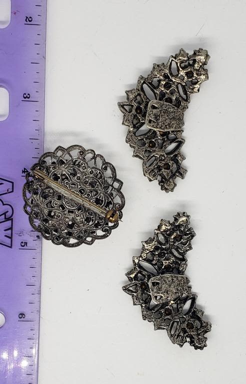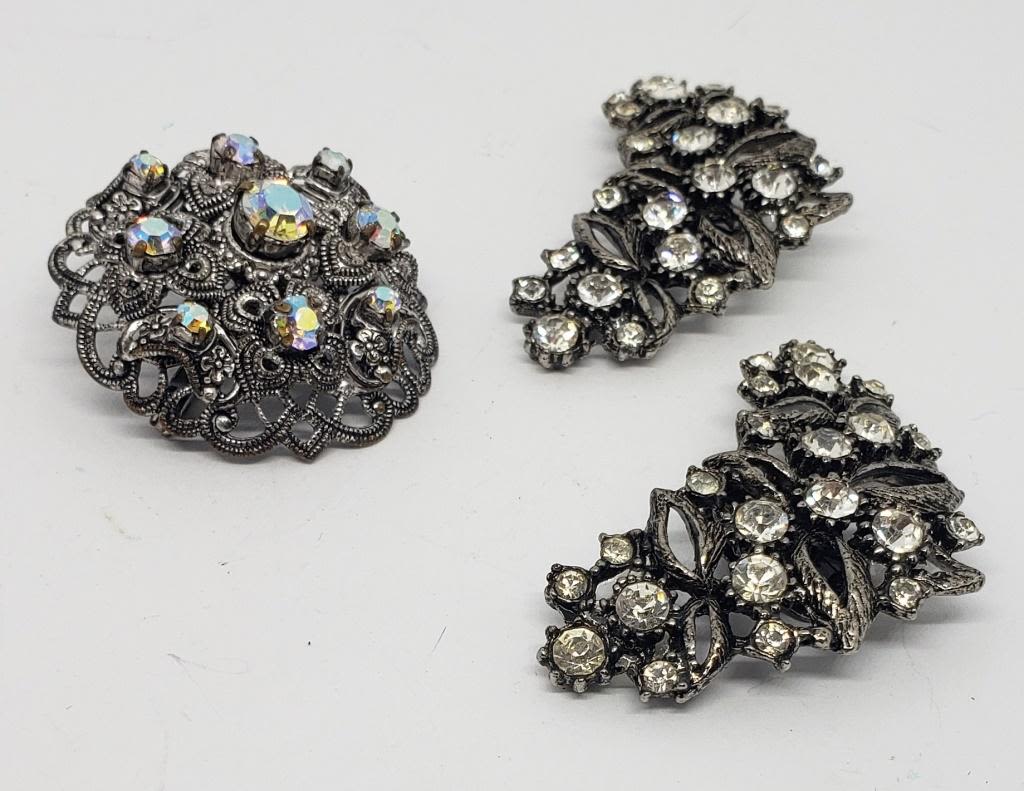 CLIPS PLUSE SILVER TONED FILIGREE DOME RHINESTONE BROOCH