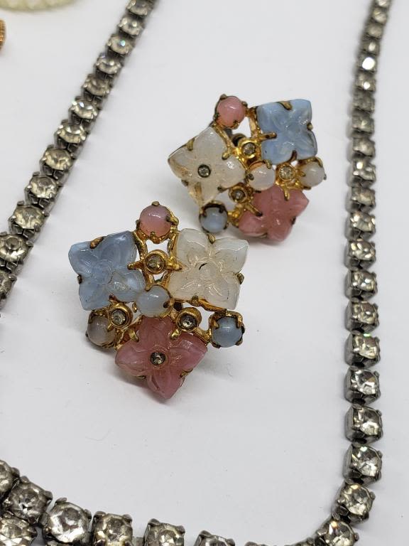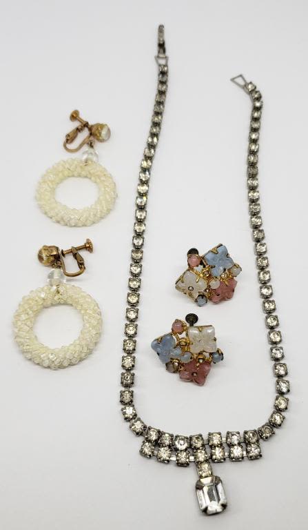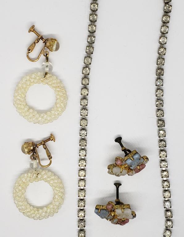 PLUS (2)PAIRS OF GOLD TONED CLIP ON EARRINGS (1)MICRO BEAD DANGLY & (1)WITH PINK AND BLUE LUCITE FLOWER CLUSTER