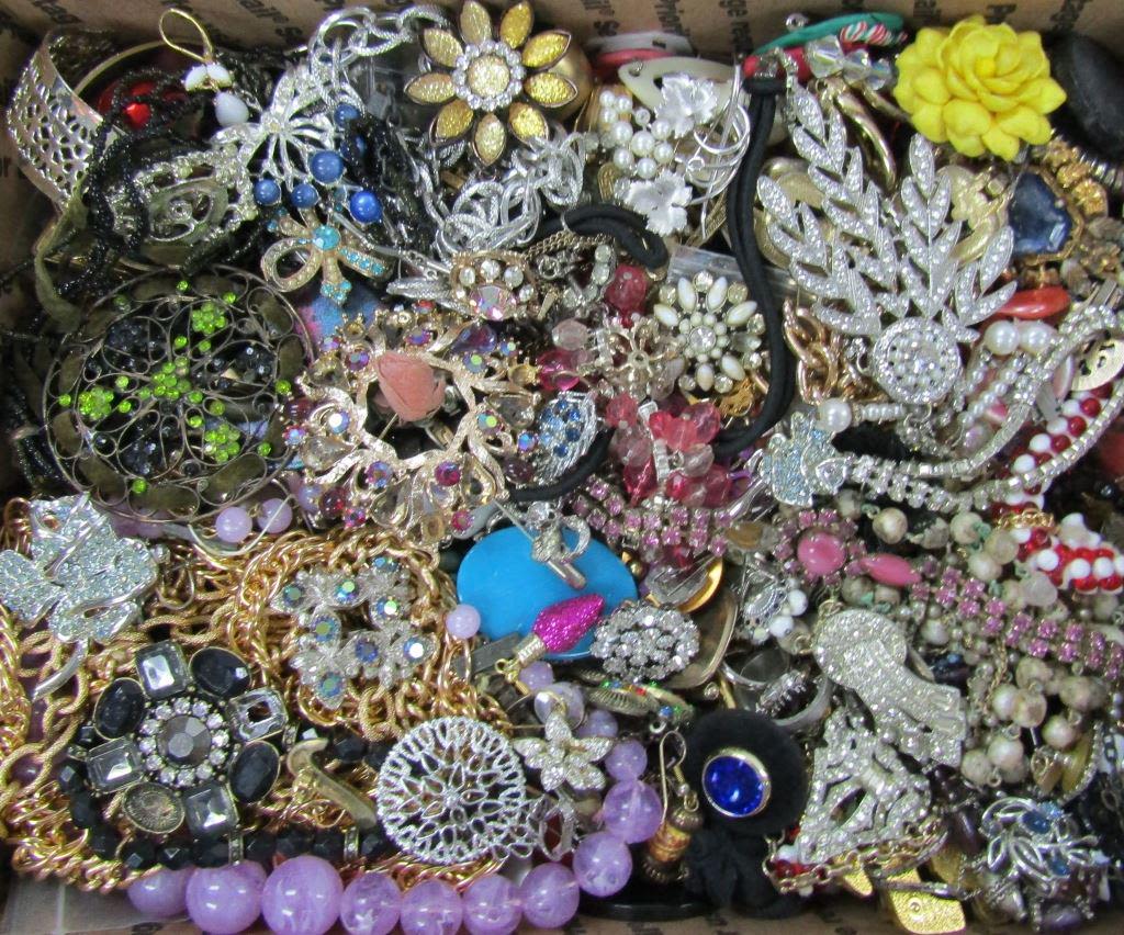 EACH LOT is UNIQUE! ABSOLUTELY A TREASURE HUNT – SOME PIECES MISSING STONES or NEEDING REPAIRED – GREAT FOR THE PINTEREST / CRAFT PERSON. MANY ITEMS NAMED – MEDIUM FLAT RATE BOX FULL (Shipping is MED. FLAT RATE COST)