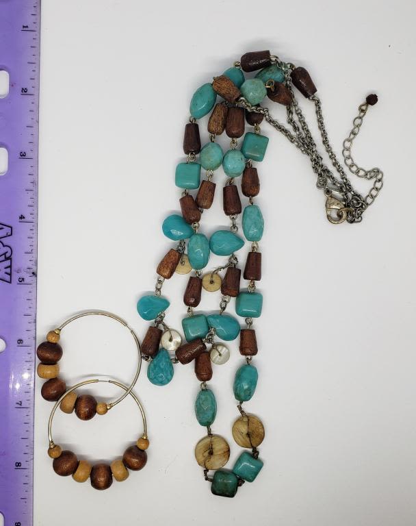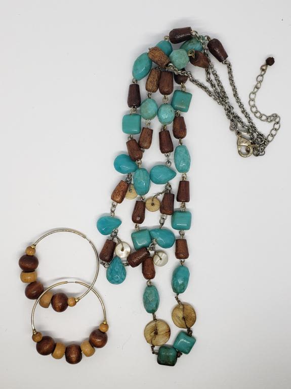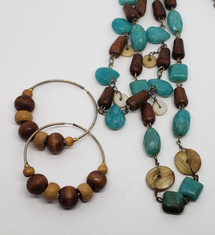 BEADS LAYERED NECKLACE PLUSE (1)PAIR OF PIERCED HOOP WOODED BEADED EARRINGS
