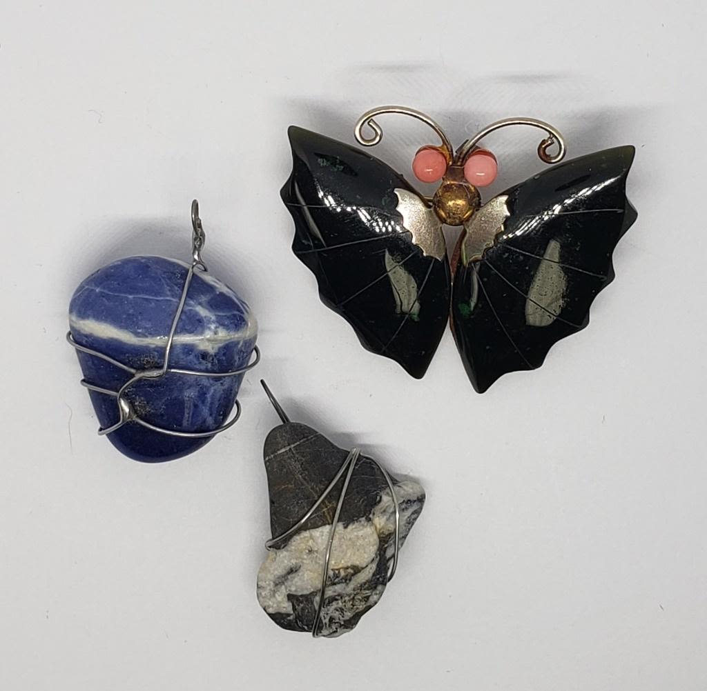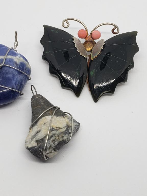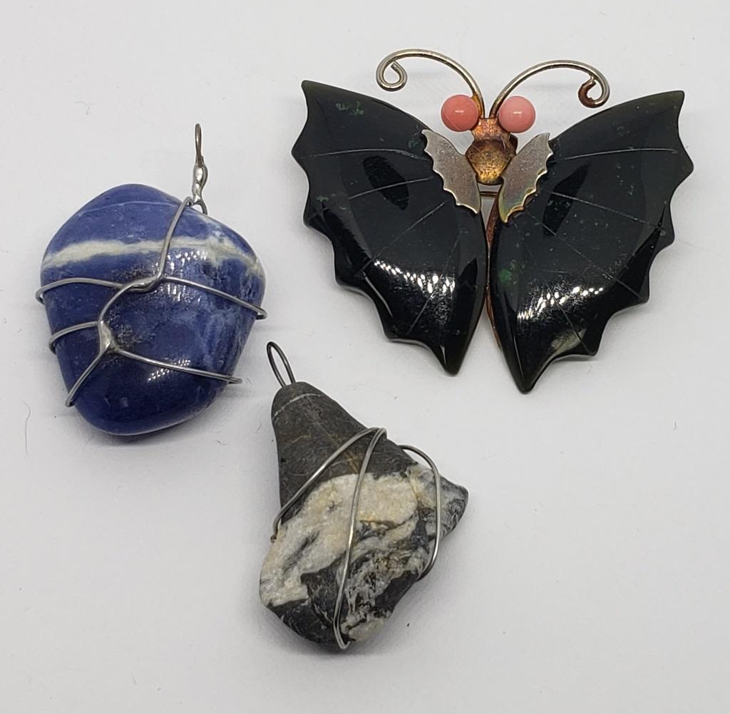 VTG GOLD TONED BUTTERFLY BROOCH WITH POSSIBLE JADITE AND PINK LUCITE BEAD ACCENTS