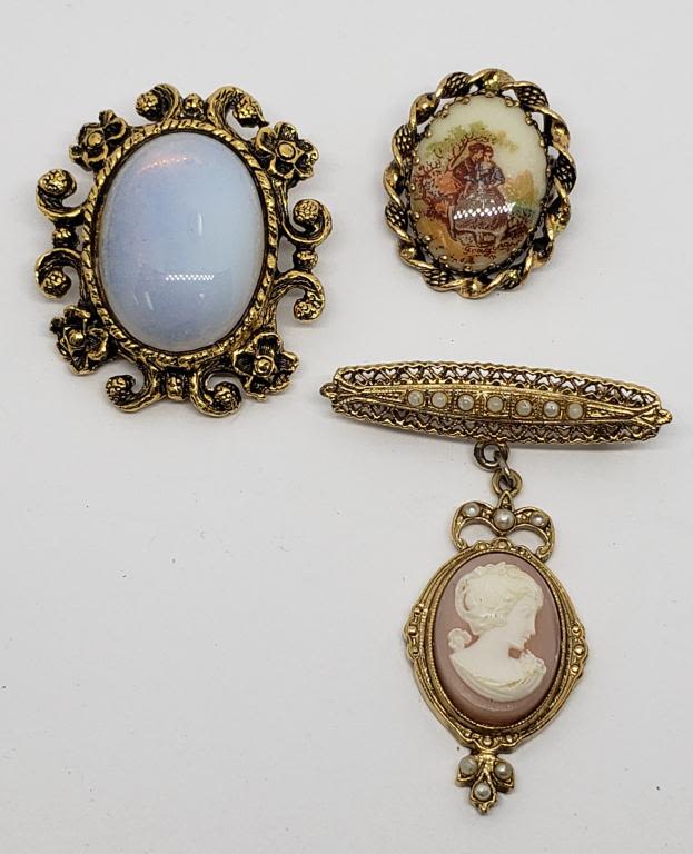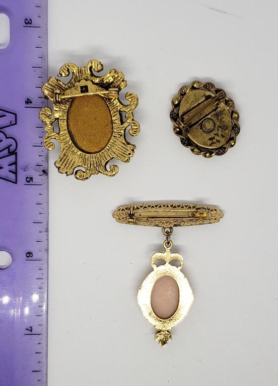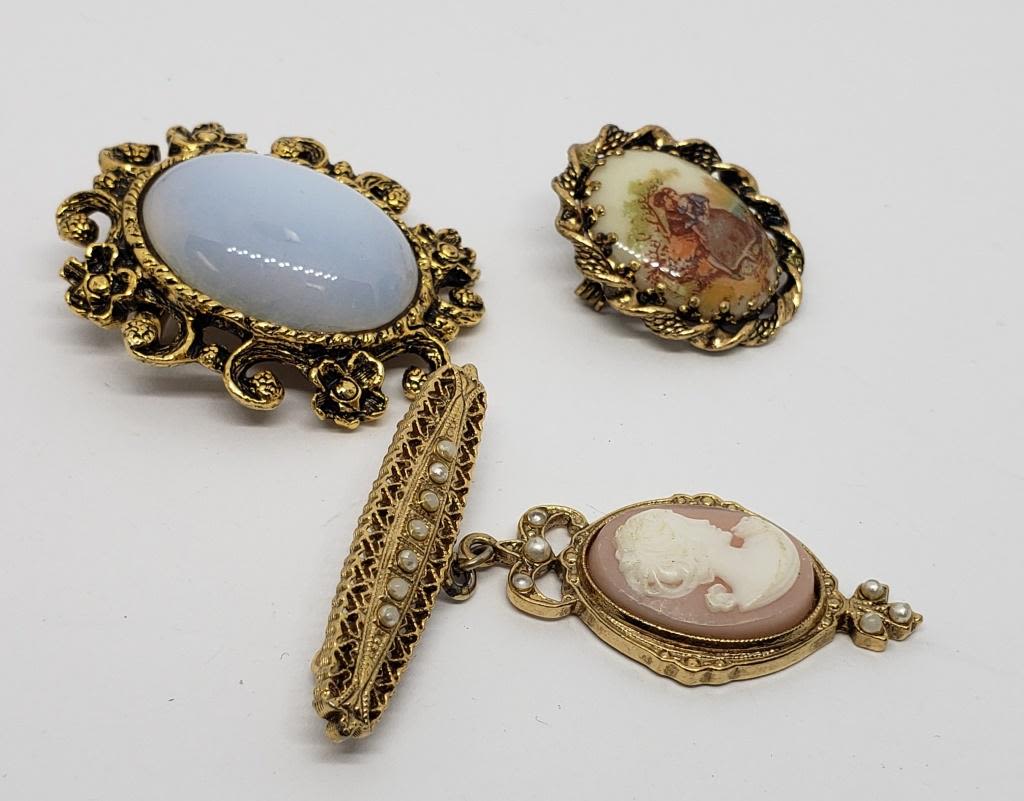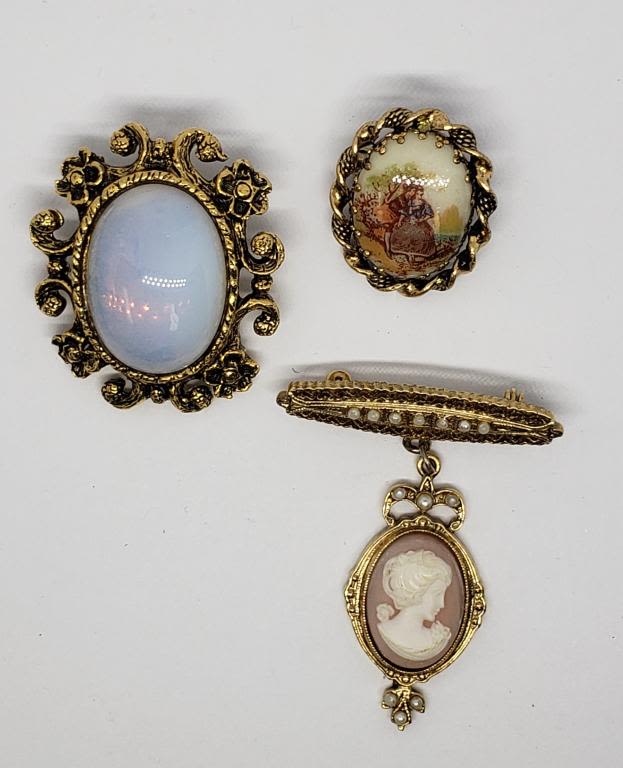 WITH FAUX PEARLS (1)WESTERN GERMANY WITH PAINTED SCENE & (1)MILKY BLUE LUCITE CENTER