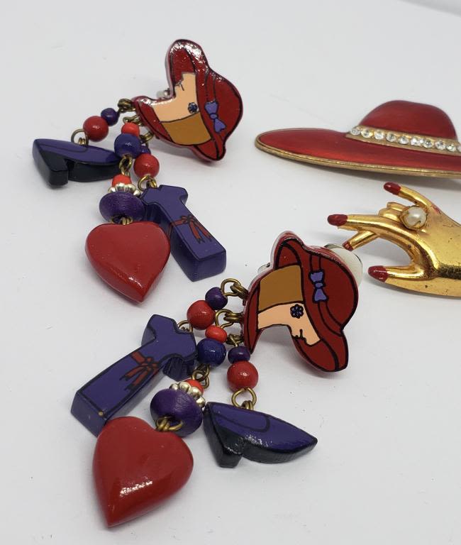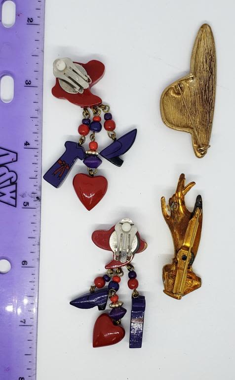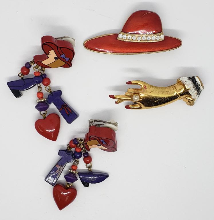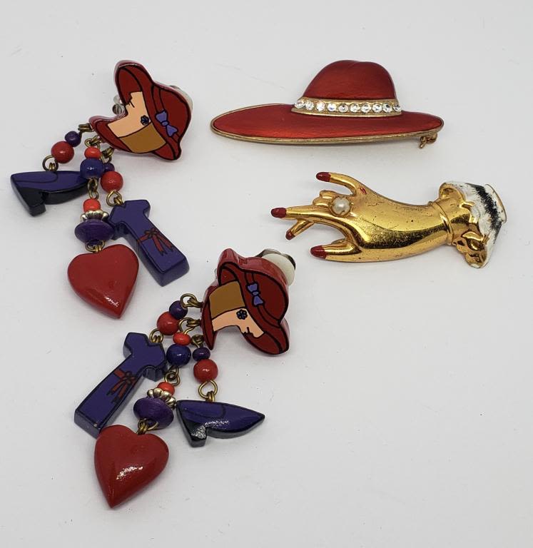 RED ENAMEL (1)PAIRS OF CLIP ON EARRINGS (1)GOLD TONED HAND BROOCH WITH ENAMEL AND FAUX PEARL