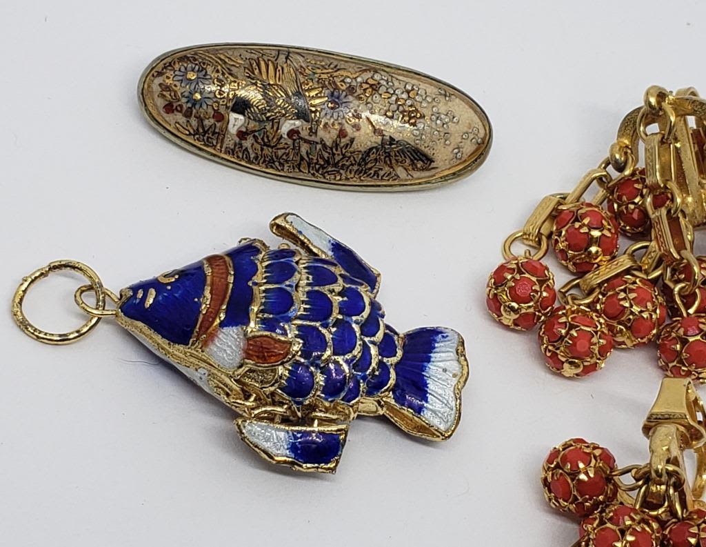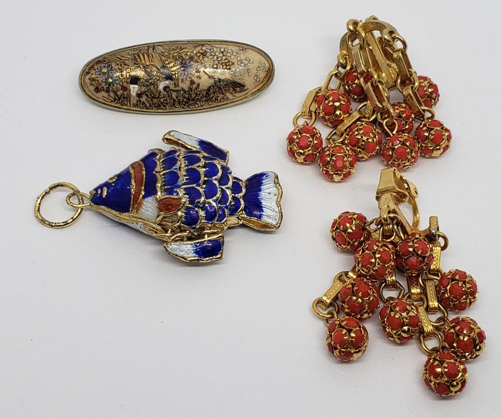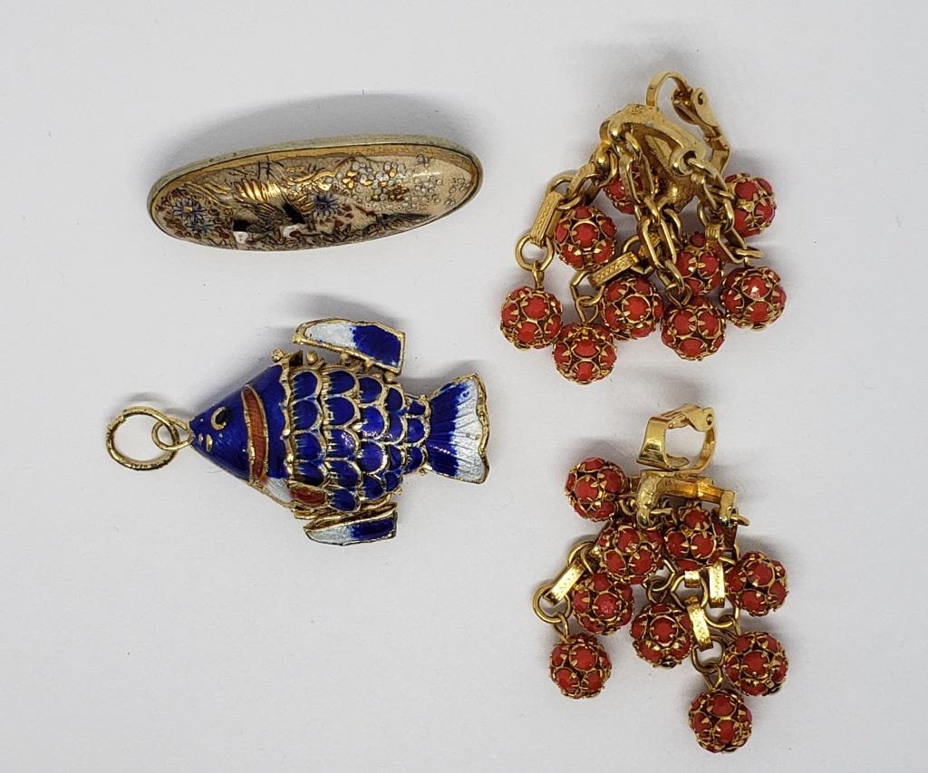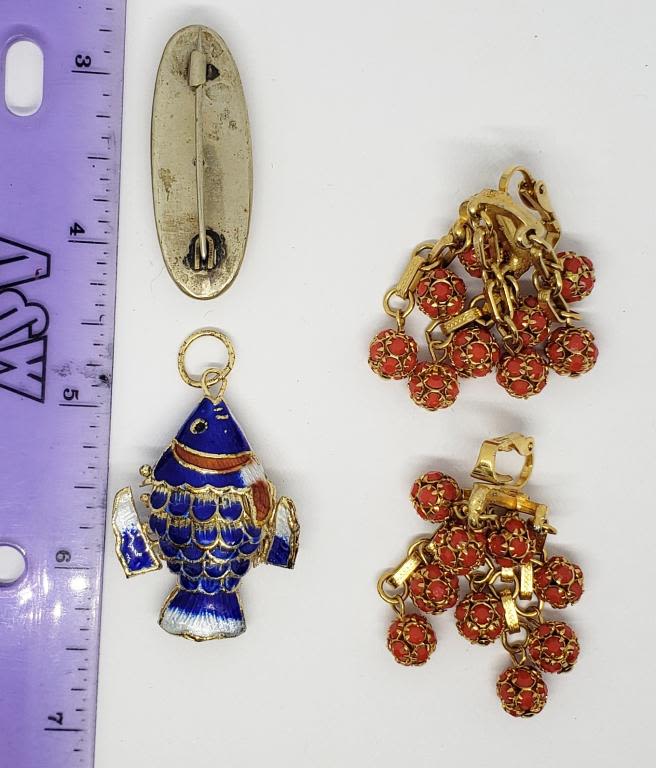 WITH ENAMEL (1)BROOCH WITH ENAMEL PAINTED SCENE & (1)PAIR OF GOLD TONED CLIP ON DANGLY EARRINGS WITH RED BEADS