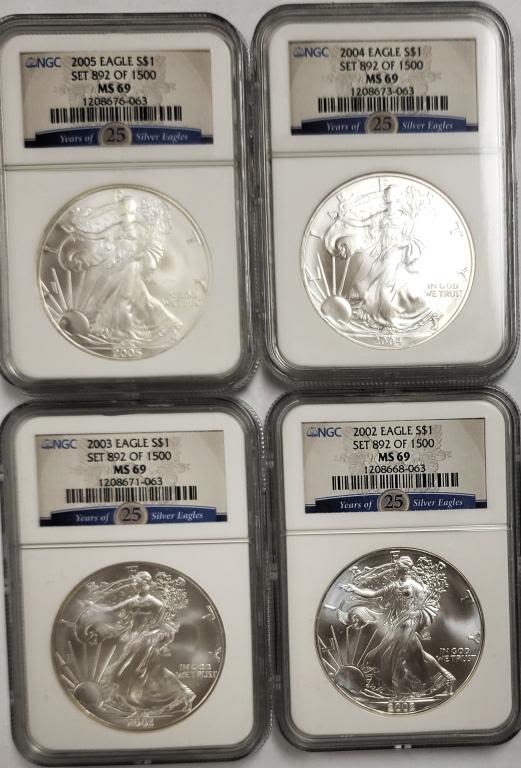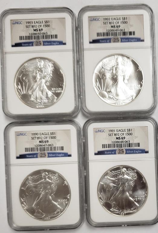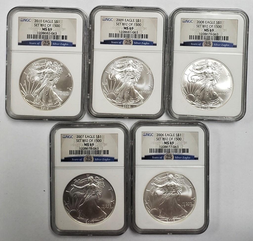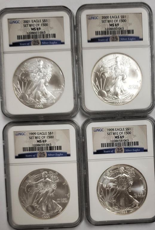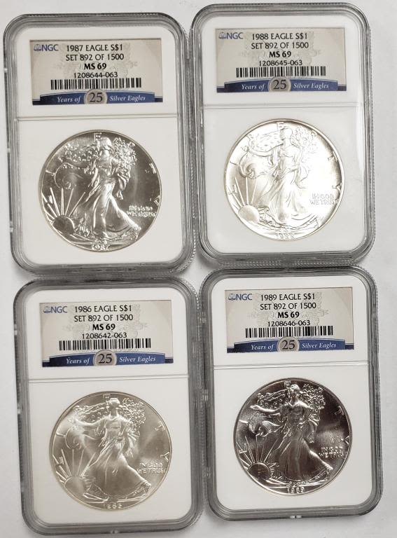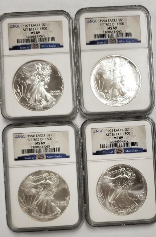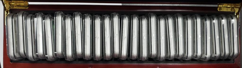 Has the 25 Years of Silver Eagles Cards on the slabs. In nice wood box