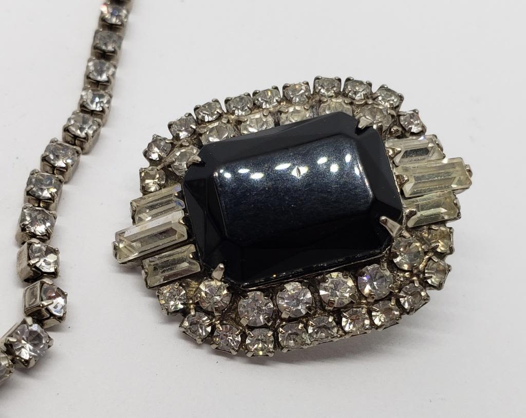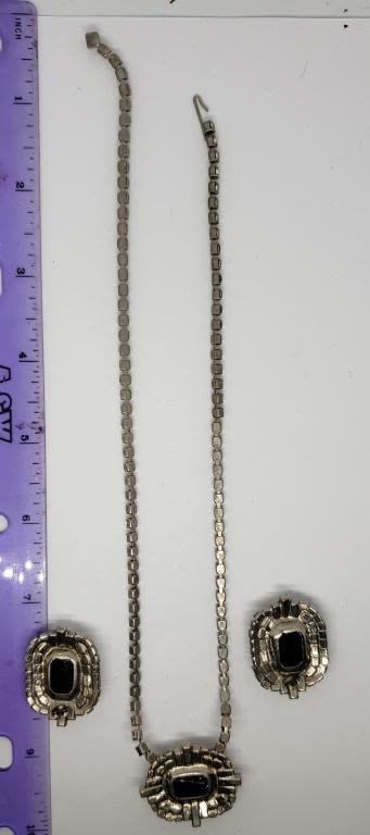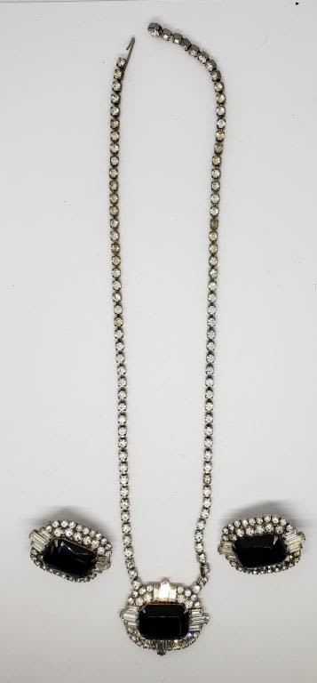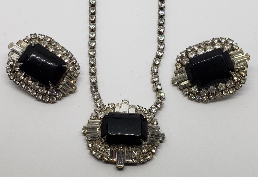 LARGE BLACK RHINESTONE CENTER PLUS MATCHING PAIR OF PIERCED EARRINGS
