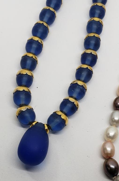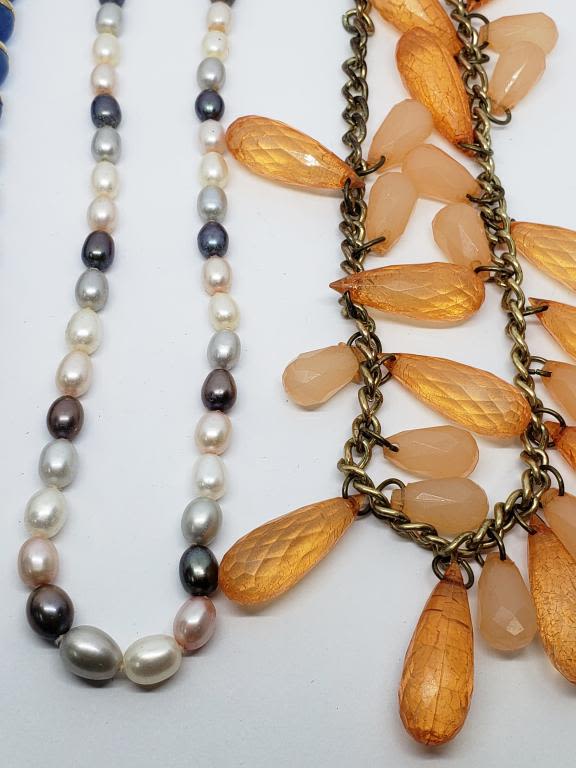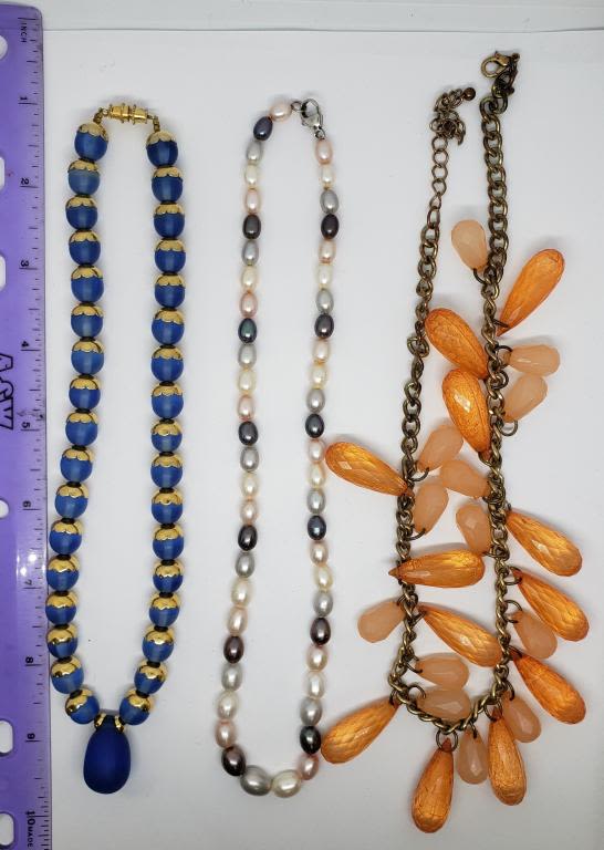 NECKLACE PLUS (2)BONUS NECKLACES: (1)MULTI COLORED FAUX PEARL & (1)GOLD TONED LINKED WITH PEACH AND ORANGE CHARMS