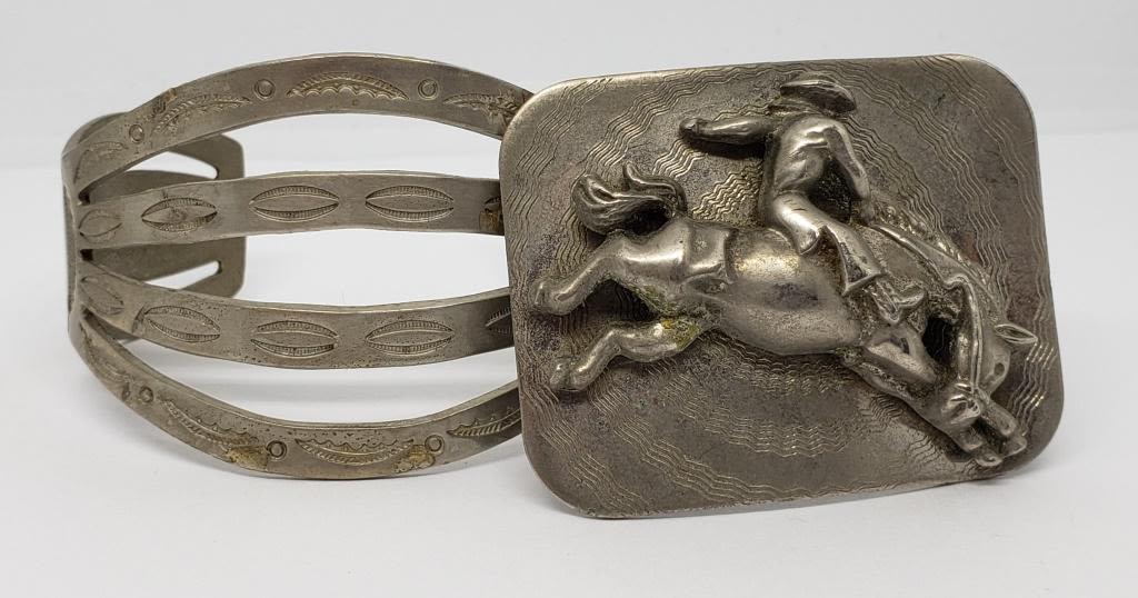 (1)PAT PEND BULL RIDING BELT BUCKLE (1)CUFF WITH ENGRAVED DESIGN