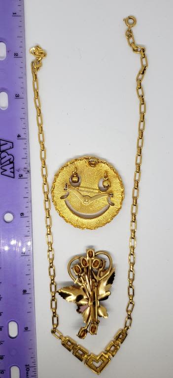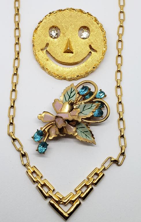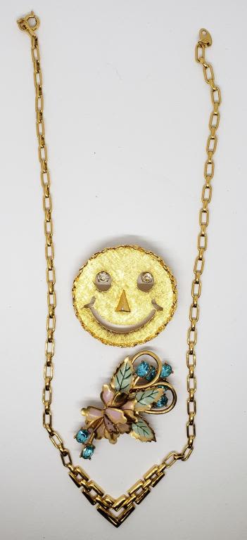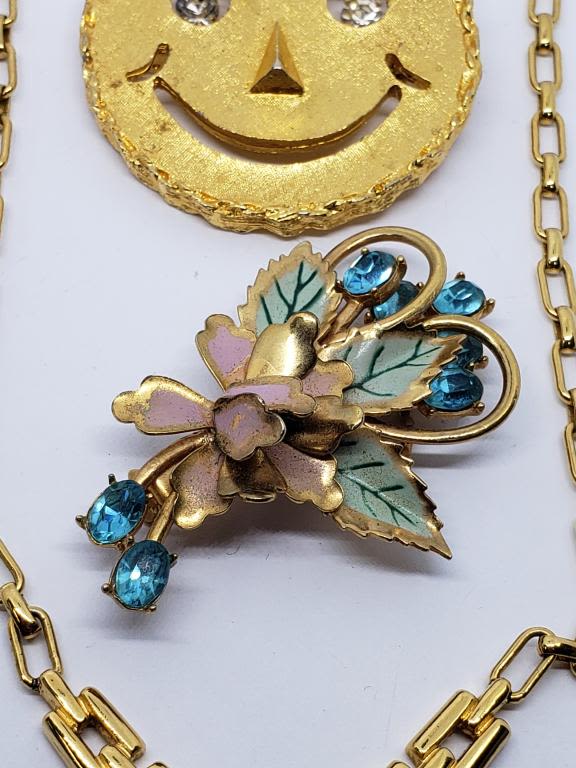 (1)SMILEY FACE WITH RHINESTONE EYES (1)FLOWER BROOCH WITH ENAMEL AND RHINESTONES