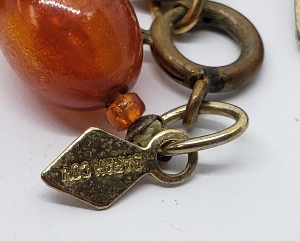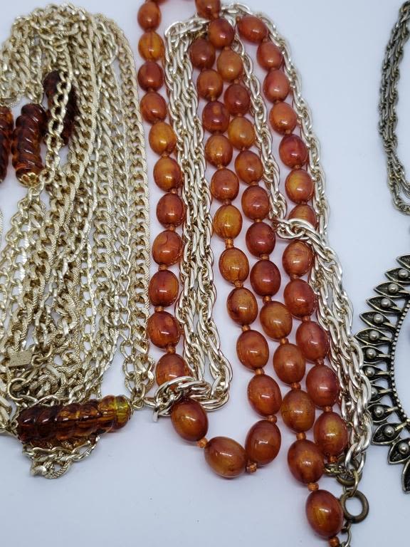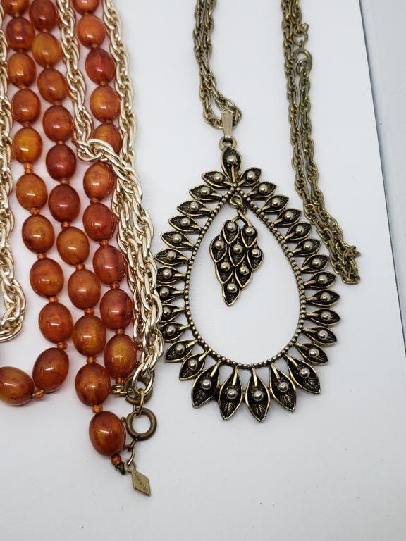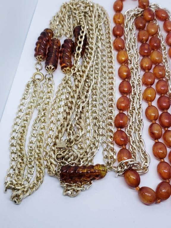 STRANDED WITH GOLD TONED LINK AND ORANGE BEADS (1)TEARDROP PENDANT WITH DANGLY CHARM (1)DOUBLE STRANDED LINKED WITH BROWN LUCITE BEADS