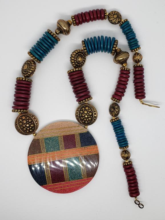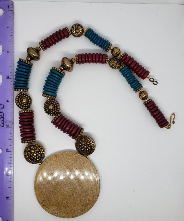 LARGE CIRCULAR PENDANT GOLD TONED BEAD ACCENTS-LOOKS NEW!