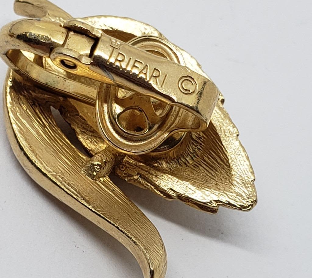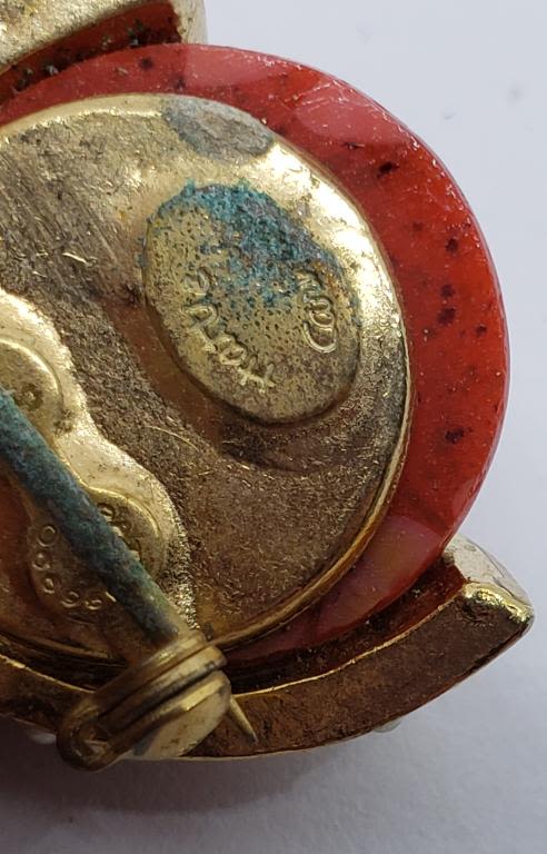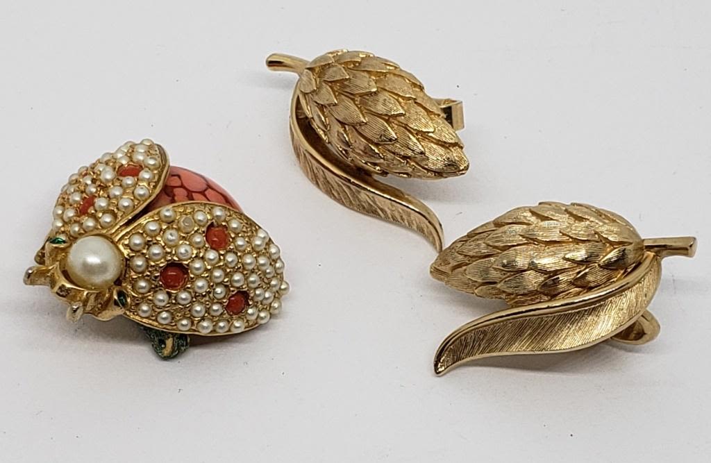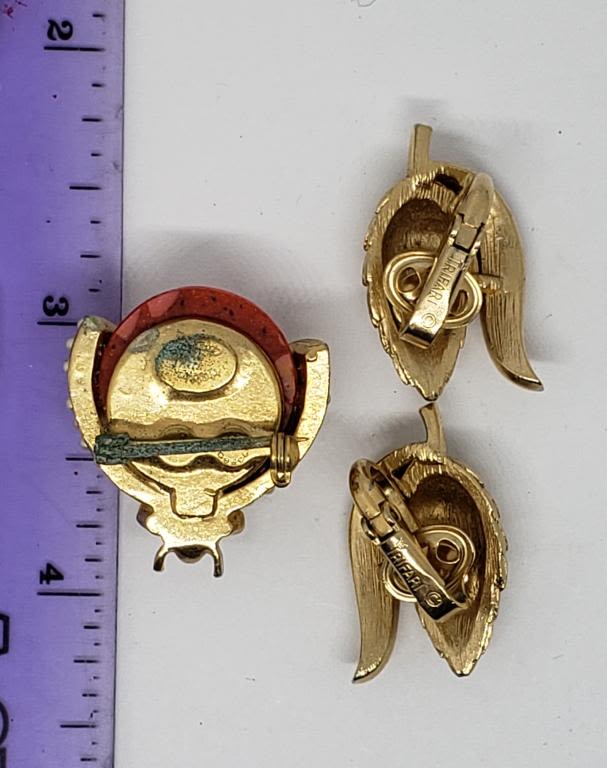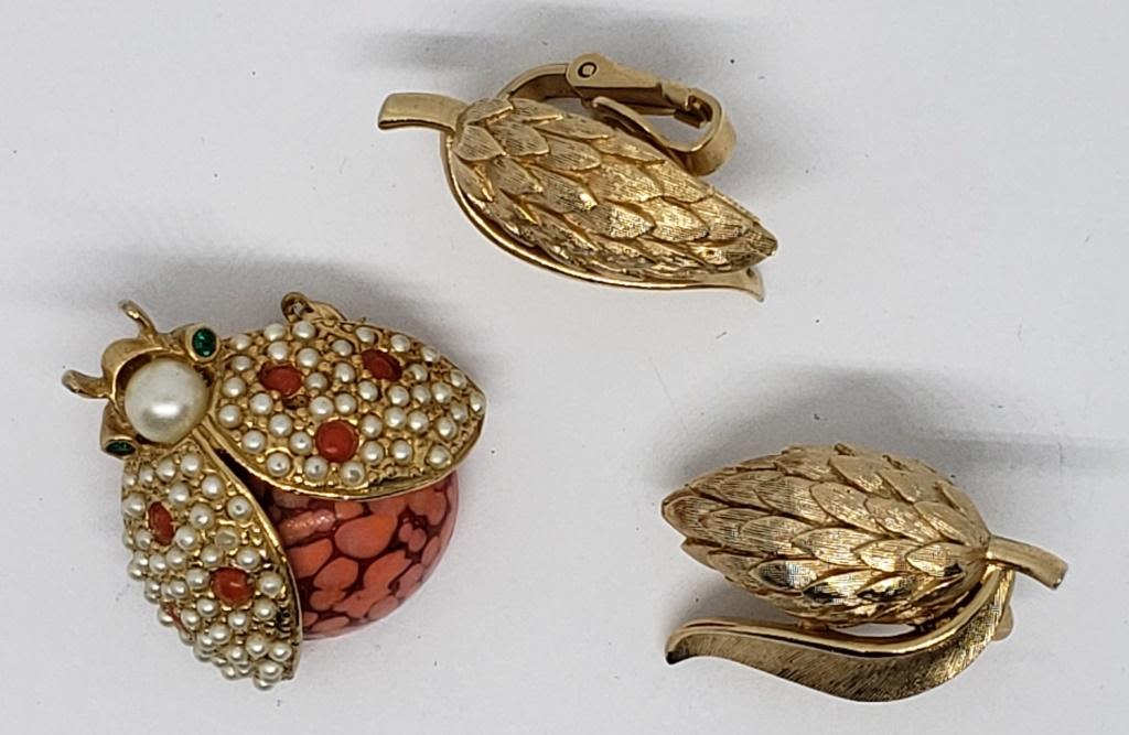 FAUX PEARLS-RED/PINK LUCITE BODY & GREEN RHINESTONE EYES PLUS BONUS TRIFARI PAIR OF WHEAT GOLD TONED CLIP ON EARRINGS