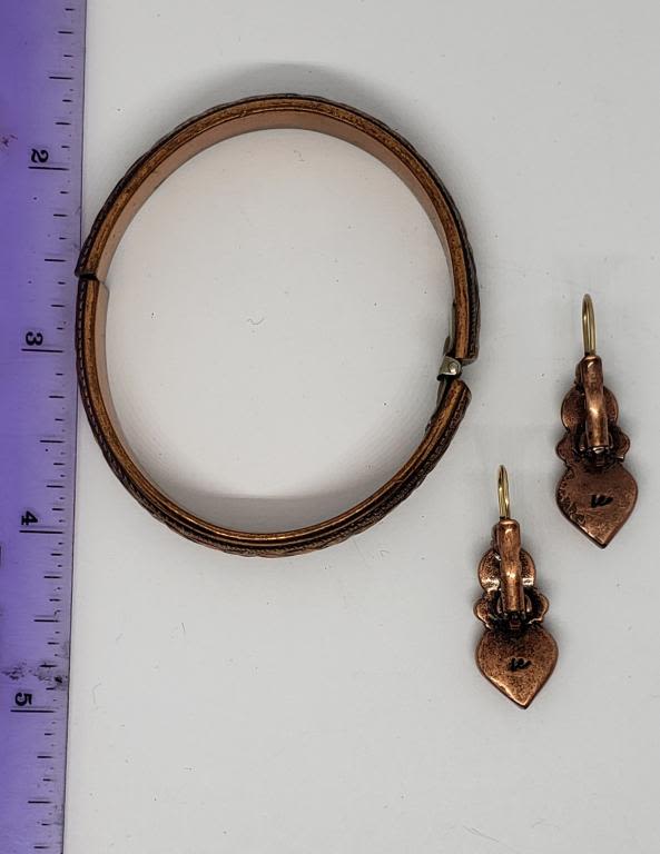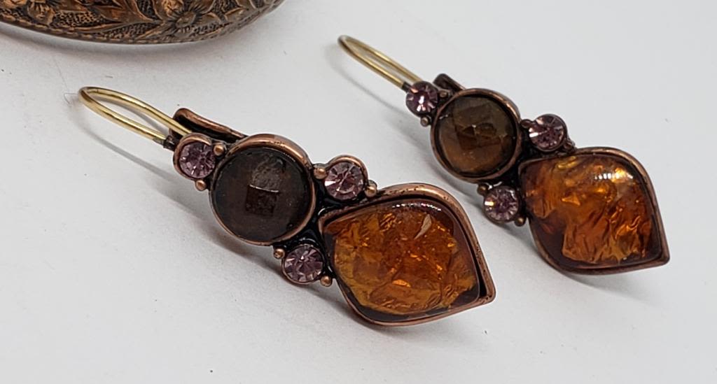 LIZ CLAIBORNE COPPER TONED PIERCED DANGLY EARRINGS WITH RESIN AND RHINESTONE ACCENT