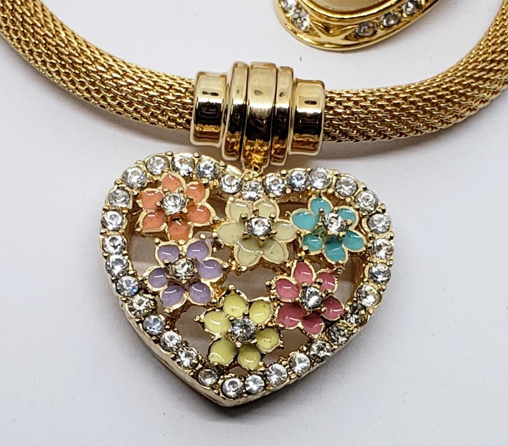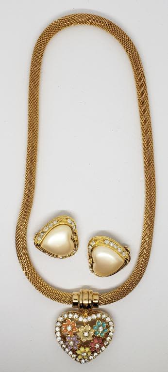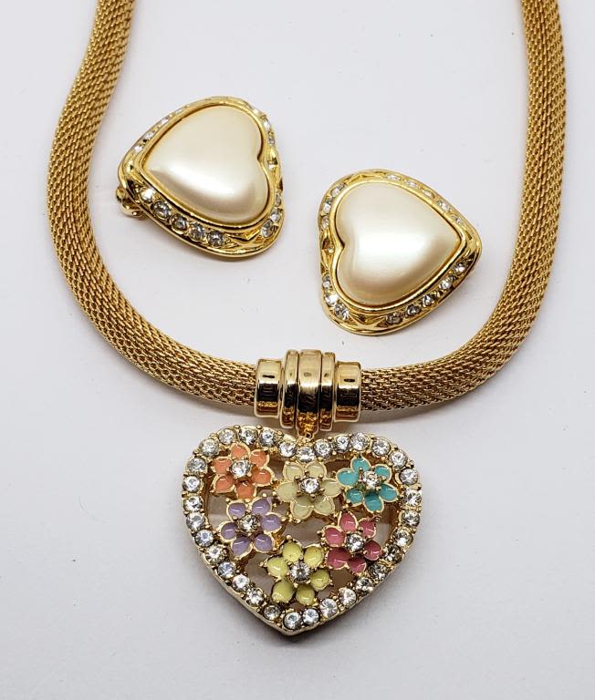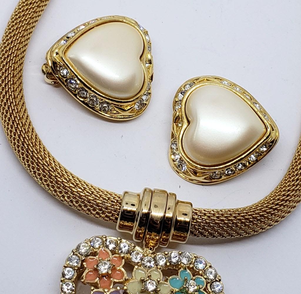 RHINESTONE BORDER FLOWERS WITH PASTEL ENAMEL CENTER PLUSE BONUS PAIR OF PIERCED HEART EARRINGS WITH RHINESTONE BORDER AND OFF WHITE LUCITE CENTER