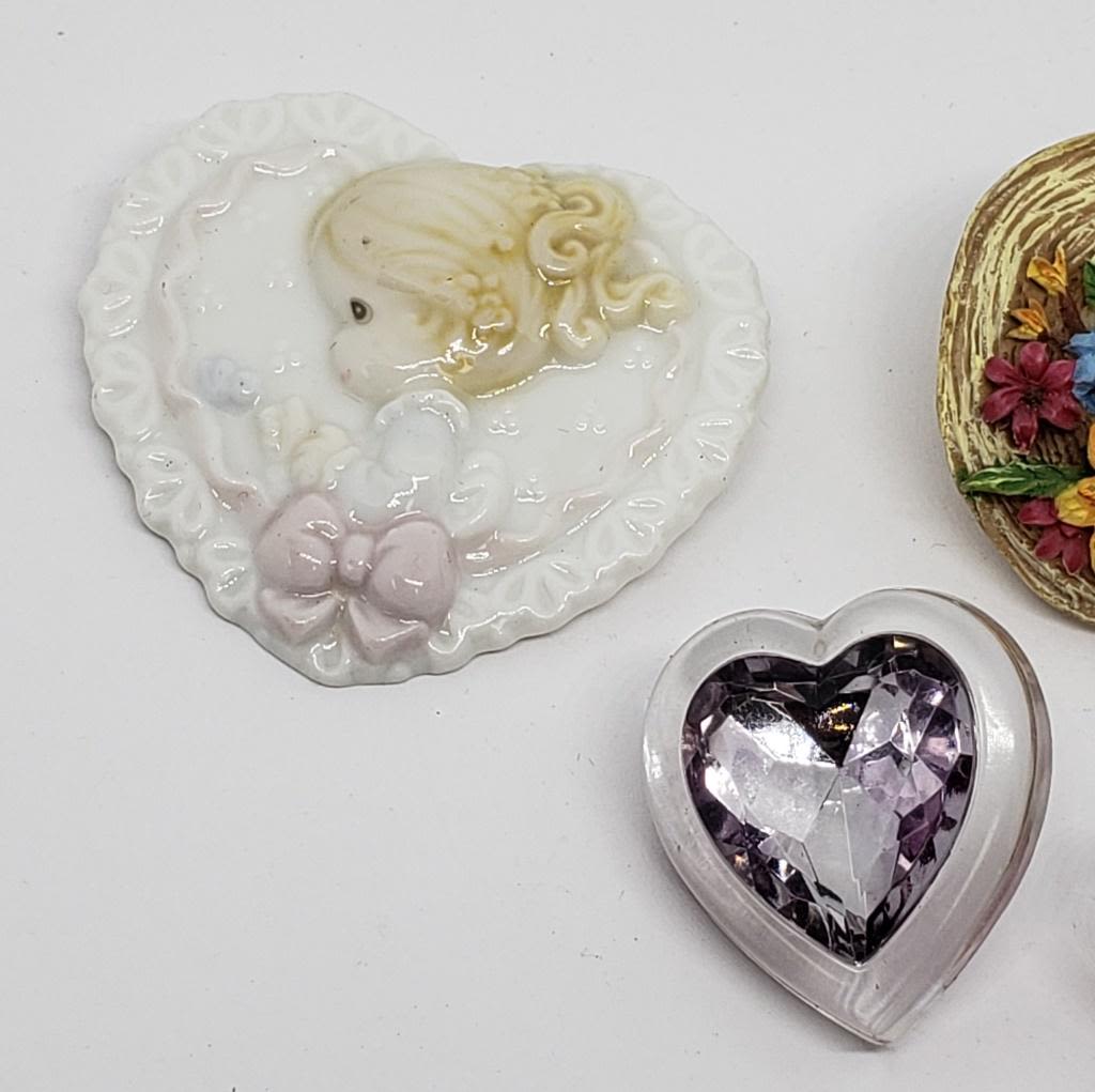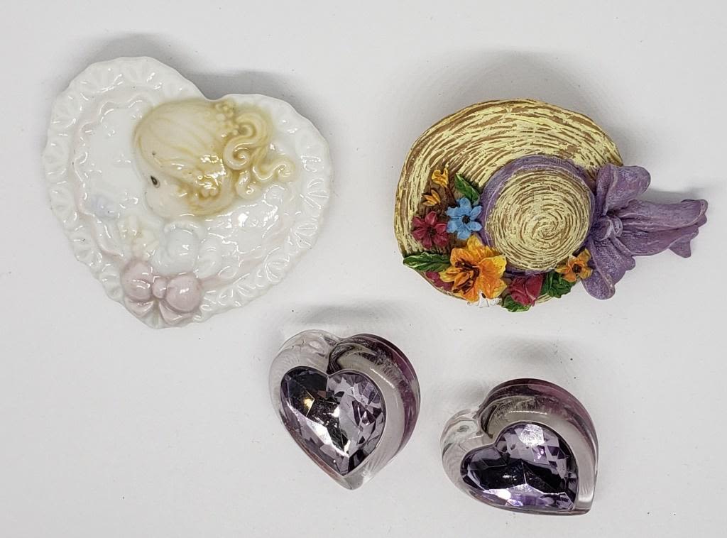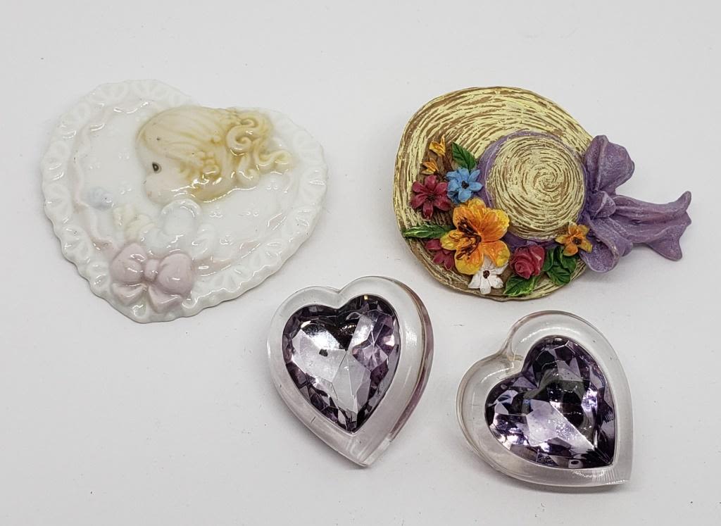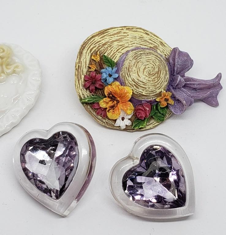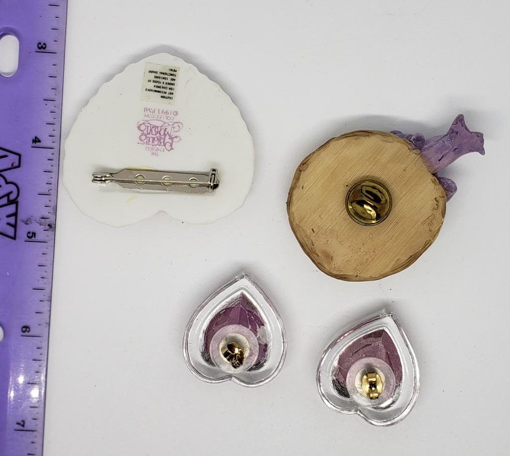 (1)CARVED WOOD HAT PIN & (1)PAIR OF CLEAR PURPLE LUCITE HEART PIERCED EARRINGS