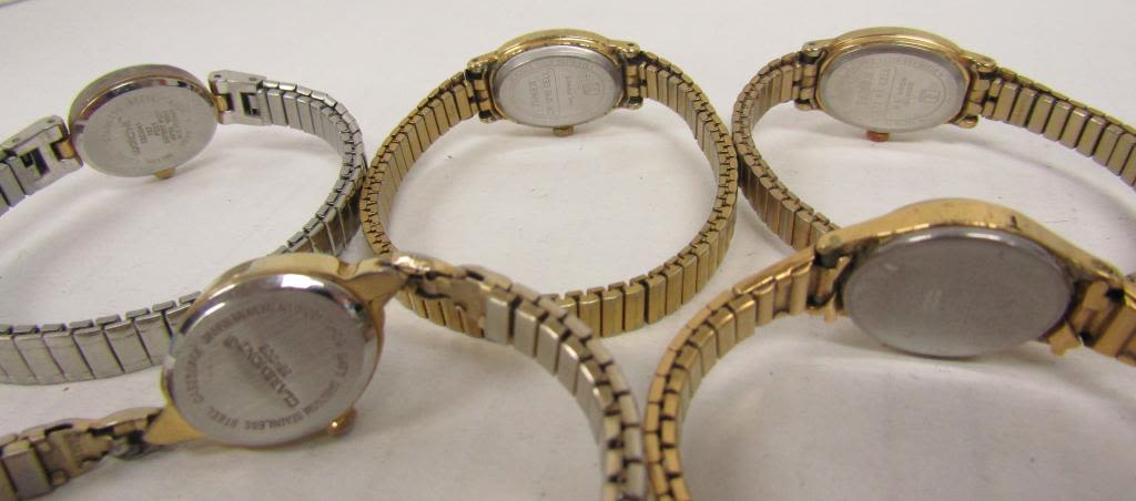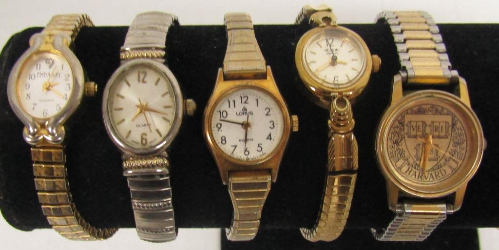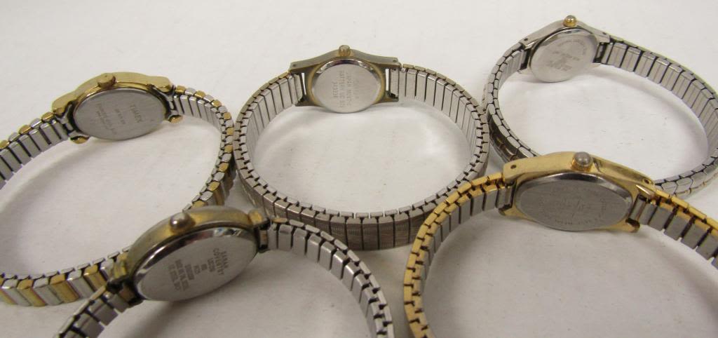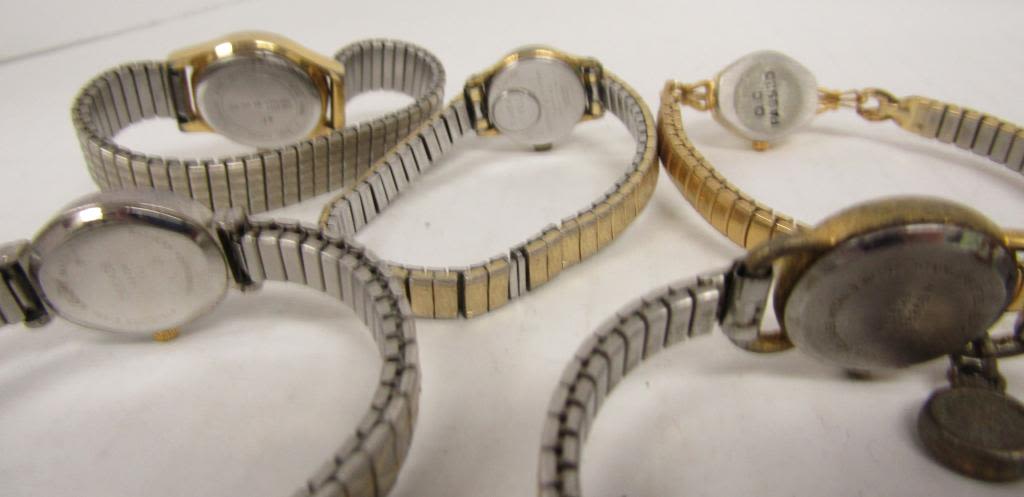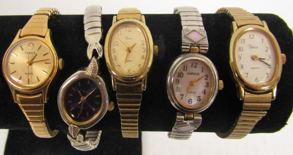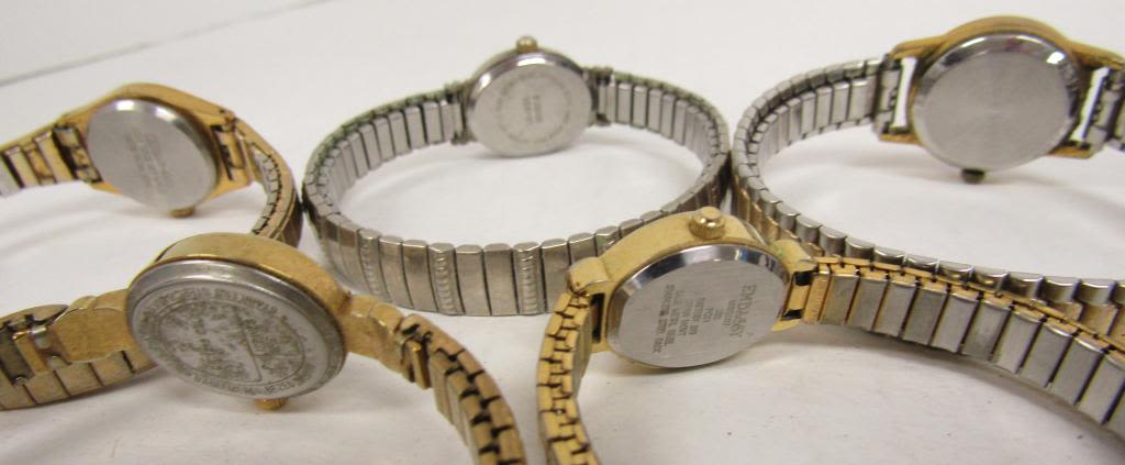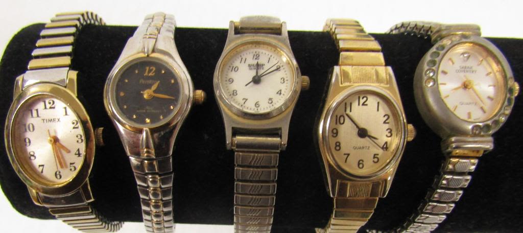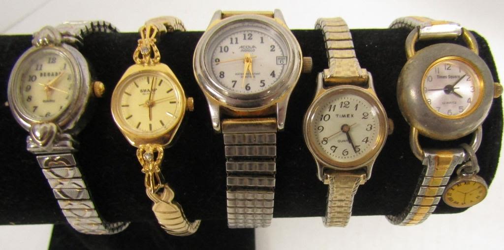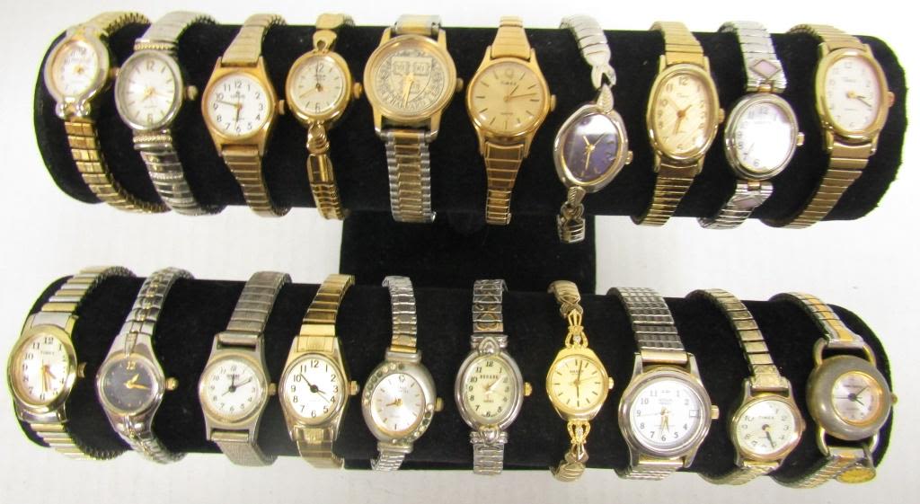 20 LADIES QUARTZ WATCHES-NOT TESTED AS TO WORKING OR NOT-SOME FOR PARTS OR REPAIR-SOME MAY WORK-STRETCH BANDS-(2)SHARP, TIMES SQUARE, LORUS, (5)TIMEX, WATCH IT, SARAH COVENTRY, (2)ACQUA, ARMITRON,